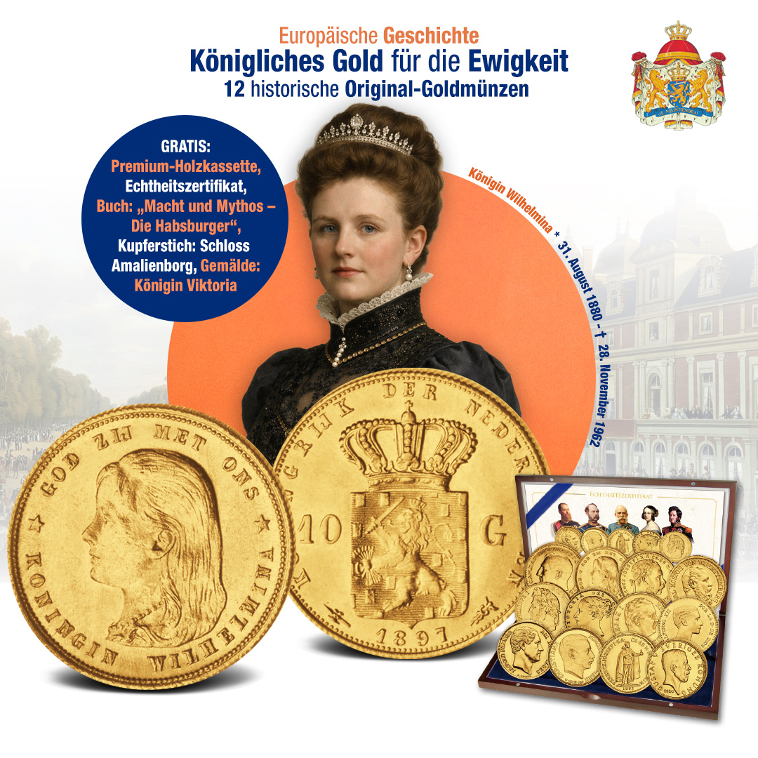 Die Goldmünzen der Kaiser und Könige Europas sind historische Dokumente der auslaufenden Monarchien wie Österreich-Ungarn, Belgien, Frankreich, Dänemark, Spanien und Württemberg. Durch historische Goldmünzen von noch existierenden Monarchien, wie den 1/2 Sovereign geprägt unter Königin und Kaiserin Victoria, ihre Mutter war eine Prinzessin von Sachsen-Coburg-Saalfeld, fühlt sich die Ära des „British Empire“ zum Greifen nah an. Ebenso die seltenen Goldmünzen des Königreichs der Niederlande, die nicht nur einen hohen Goldgehalt besitzen, sondern vor allem durch den historischen Sammlerwert besonders wertvoll sind. Dasselbe gilt für die seit vielen Jahren erstmals wieder angebotenen 5 Kronen von König Gustaf V. (Sohn einer Prinzessin von Nassau), erster „ungekrönter“ König von Schweden: War diese Münze im Dezember 2017 noch mit € 245,– bei uns offeriert, liegt der Verkaufspreis heute etwa doppelt so hoch. Das ist eine Wertsteigerung von fast 100% – und das ist längst nicht das Ende!