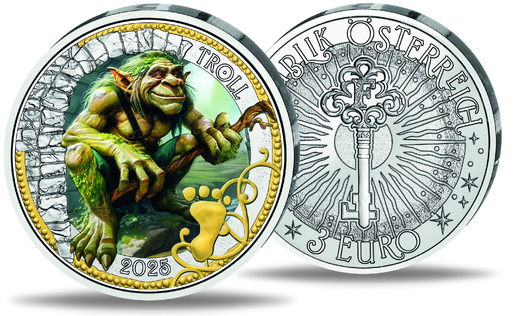 Den Auftakt zum Start der Serie „Fantastische Fabelwesen“ macht der Troll: farbenfroh und detailreich gestaltet, kauert er unter einer steinernen Brücke, flankiert von geheimnisvollen Ornamenten und einem geheimnisvollen Fußabdruck. Unter Schwarzlicht erstrahlt das Motiv in voller Intensität – die Farben glühen, der Schriftzug leuchtet, und der Troll wirkt, als trete er direkt aus der Münze hervor. Die Rückseite der 3-Euro-Münze zeigt einen geheimnisvollen Schlüssel, der laut der Geschichte im Begleitbuch den Zugang zu den fantastischen Fabelwesen eröffnet.