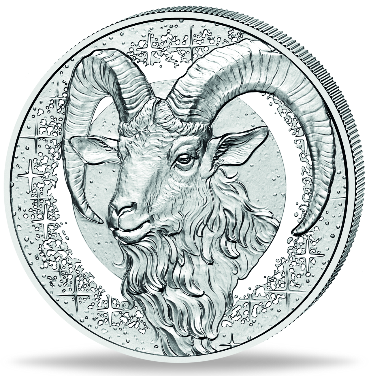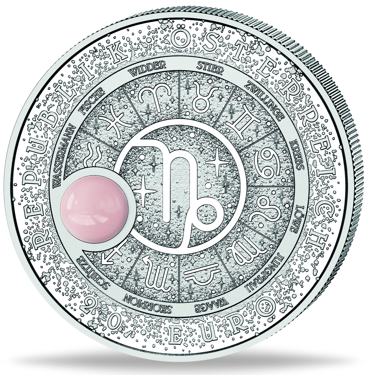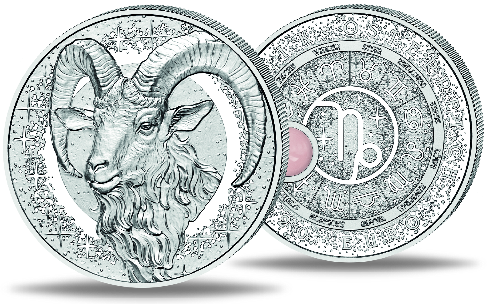 Die Bildseite zeigt eindrucksvoll das plastische Porträt eines Steinbocks, das scheinbar aus der Münzfläche hervortritt – entschlossen, majestätisch und voller Ausdruckskraft. Diese dreidimensionale Darstellung steht sinnbildlich für die innere Stärke des Sternzeichens. Auf der Wertseite entfaltet sich die Symbolik weiter: Vier konzentrische Ringe gliedern das Design. Der äußere Ring trägt die Wertangabe „20 EURO“ und das Ausgabeland „REPUBLIK ÖSTERREICH“. Im zweiten Ring sind alle zwölf Sternzeichen namentlich aufgeführt, während der dritte ihre Symbole zeigt – ergänzt durch einen Rosenquarz, den Halbedelstein des Steinbocks. Im Zentrum strahlt die Sternbild-Konstellation des Steinbocks – astronomisch korrekt und mit feiner Detailtiefe umgesetzt.