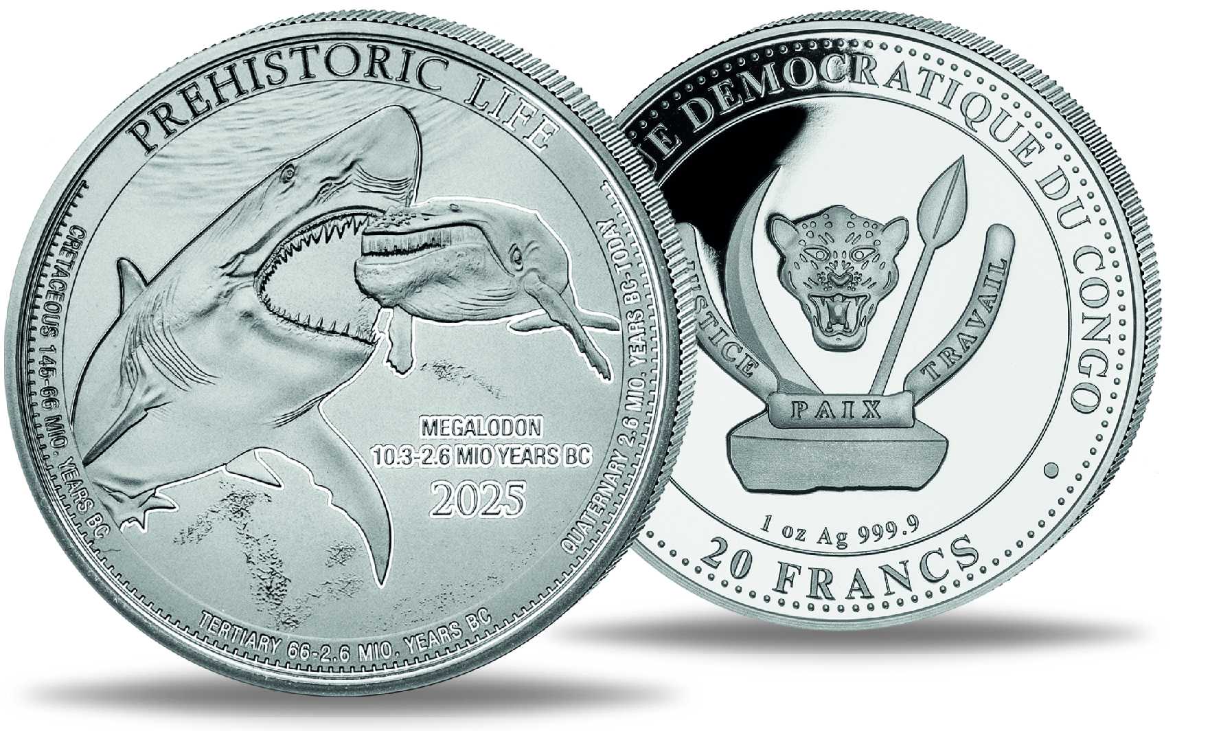 Kongo, 20 Francs 2025, Megalodon Prehistoric Life II, 1 Unze Ag - Silber