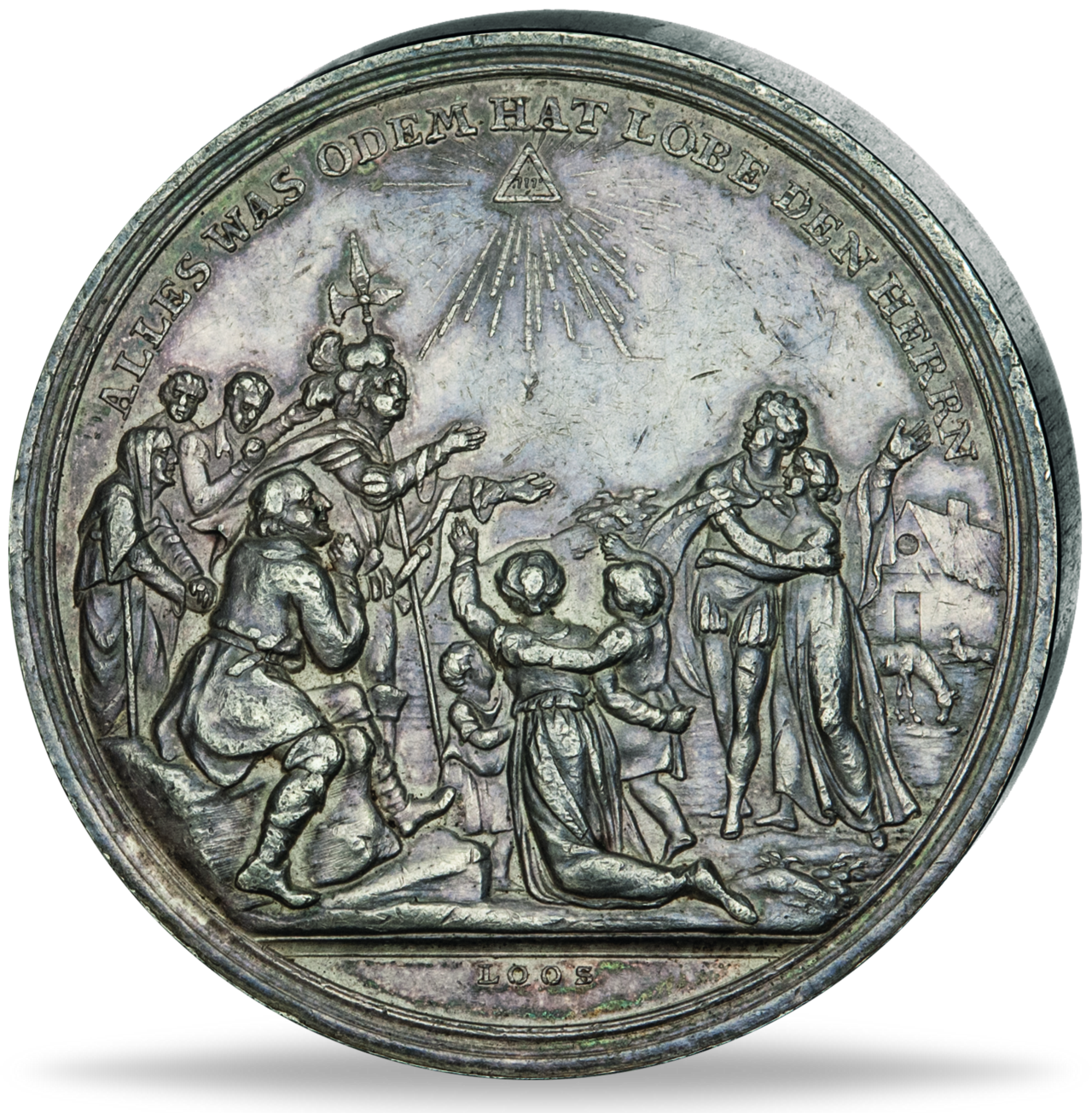 Die Friedensgöttin, hält den Genius mit Lorbeerzweig, welcher ein Füllhorn ausschüttet, darunter der Globus mit West- und Mitteleuropas !