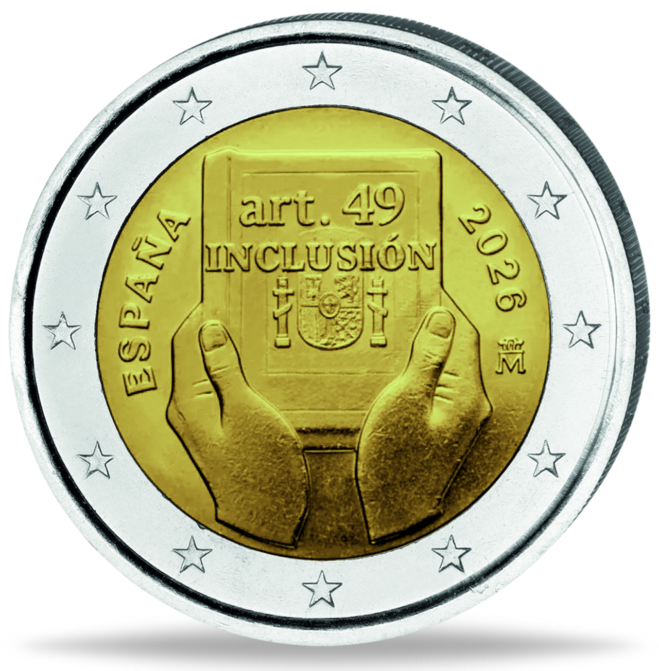 Die Motivseite greift dieses Anliegen in klarer, symbolstarker Bildsprache auf: Zwei Hände halten ein geöffnetes Buch – Sinnbild der spanischen Verfassung als Fundament von Rechten und Schutz. Über dem Buch steht die Inschrift „art. 49 INCLUSIÓN“, die den verfassungsrechtlichen Bezug deutlich macht. Links ist der Landesname „ESPAÑA“ zu lesen, rechts daneben das Ausgabejahr „2026“ sowie das Münzzeichen der Königlichen Münze. Die Darstellung wirkt bewusst ruhig und würdevoll – ein Ausdruck von Respekt, Verantwortung und dem Streben nach echter gesellschaftlicher Teilhabe.