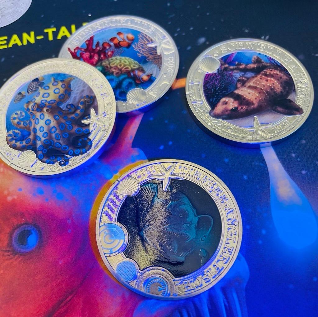 Und inzwischen sind auch alle Ausgaben bereits erhältlich oder zumindest vorbestellbar: „Blaugeringelter Krake“, „Schwellhai“, „Leuchtgarnele“, „Steinkoralle“, „Tiefseeanglerfisch“, „Leuchtkalmar“, „Nacktkiemerschnecke“, „Jamaika-Stechrochen“, „Blauer Doktorfisch“, „Leuchtqualle“, „Zwergtintenfisch“ und „Buckel-Drachenkopf“ – so wird den zukünftigen Münzfans und Ihnen der Einstieg ins Sammeln ganz leicht gemacht!