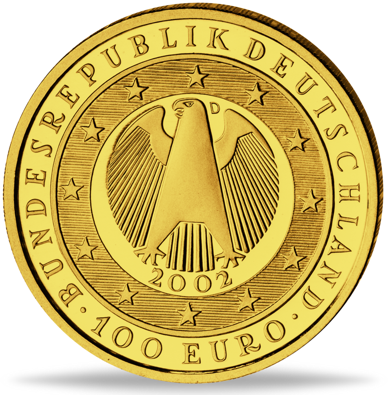 Seit Einführung des Euros im Jahr 2002 wird jährlich eine Goldmünze mit einem Nennwert von 100 € geprägt. Wir freuen uns Ihnen die erste 100-Euro-Goldmünze der BRD zu präsentieren – einzig im Jahr 2002 zur Euro-Einführung ausgegeben. Die Münze soll an den Erfolg der Goldmark anknüpfen und ein dauerhaftes Erinnerungsstück an dieses historische Ereignis sein.