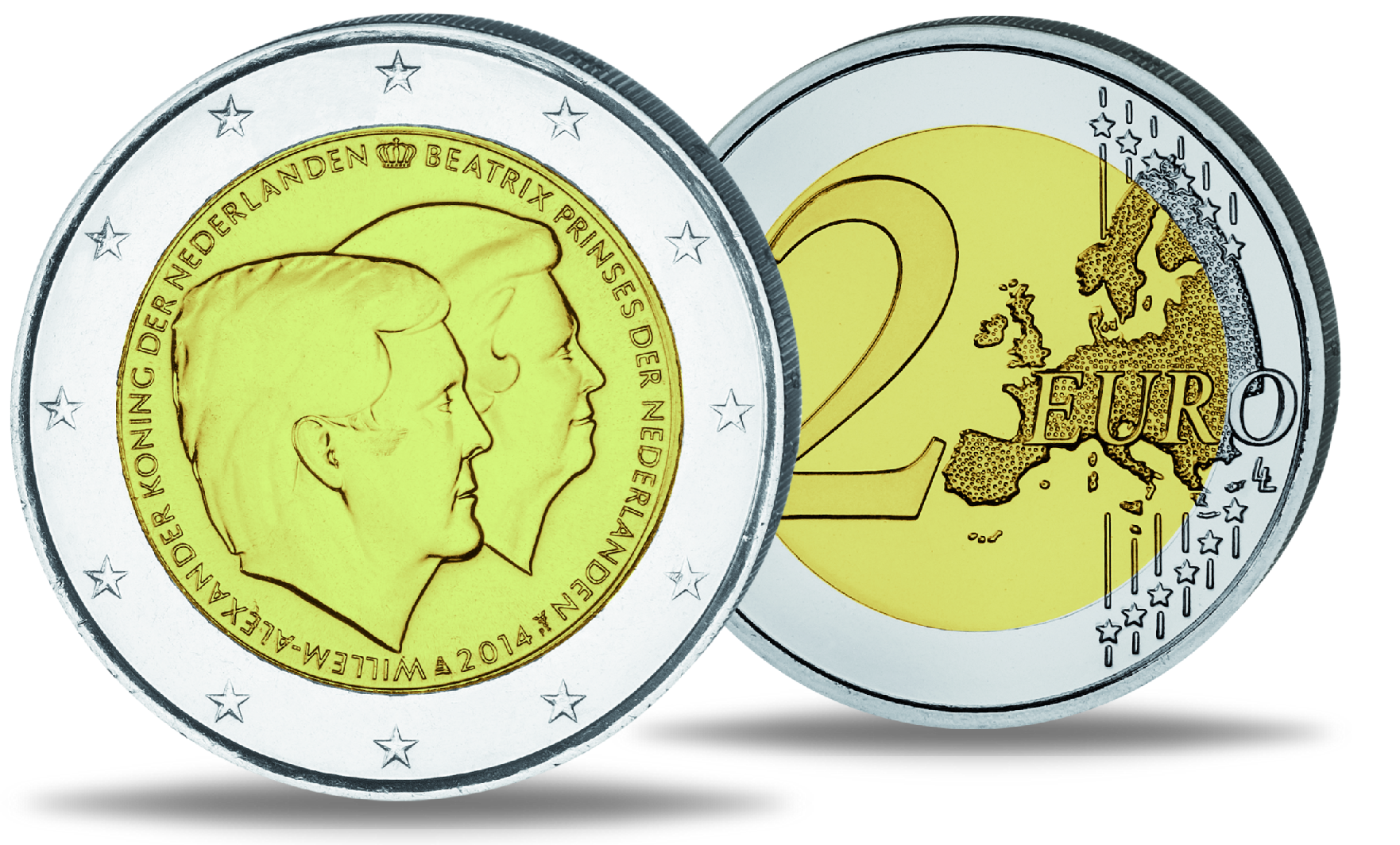 Die niederländische Königin Beatrix hat am 28. Januar 2013 bekanntgegeben, dass Sie abtritt. Aufgrund dieser Entscheidung hat sich das niederländische Finanzministerium dafür entschieden eine 2 Euro Sondermünze herauszugeben. Auf der Münze sind der Kopf der König und der Kopf des Prinzen abgebildet. Am linken Rand der Münze befindet sich die Inschrift WILLEM-ALEXANDER PRINS VON ORANJE, am rechten Rand die Inschrift BEATRIX KONINGIN DER NEDERLANDEN. Oben ist die Königskrone abgebildet, unten befinden sich die beiden Münzzeichen und das Datum 28 Januari 2013.Während der 33-jährigen Regentschaft Beatrix hat sich die Einstellung der Niederländer zum Königshaus gewandelt. Die kritischen Stimmen sind leiser geworden. Als sie 1980 antrat, endete der Tag ihrer Thronbesteigung in Straßenschlachten zwischen Polizei und Hausbesetzern. Für den Slogan Keine Wohnung, keine Krönung gab es viel Sympathie im gesellschaftlichen Mainstream. Vielen Gewerkschaftern war es bei den Feierlichkeiten zum Koninginnedag nicht wohl, während sich heute vom Baggerfahrer zum Banker alles an den Grachten tummelt, wenn die Königin gefeiert wird. Beatrix wird im Unterschied zu ihrer Mutter Juliana mehr respektiert als geliebt. Beatrix spiele ihre Rolle gut, nur die Institution sei schlecht, hörte man nach ihrer Rücktrittsankündigung. Es ist kaum zu erwarten, dass die große Zustimmung, die die Oranjes genießen, umschlagen wird. Das dürfte Beatrix Nachfolger, Prinz Willem-Alexander und dessen Frau Maxima, garantieren. Der Thronfolger hat sein Image als trinkfreudiger Schürzenjäger abgestreift. Sein Interesse gilt inzwischen einer anderen Flüssigkeit: dem Wasser und der Frage des Wassermanagements – ein Thema, das die Niederländer in Zeiten des Klimawandels zunehmend in Beschlag nehmen wird. Ehefrau Maxima wird allgemein als herzliche, warme Ergänzung des etwas knöchern wirkenden Prinzen gesehen und mischt sich auch in gesellschaftliche Debatten ein, wie es ihre Schwiegermutter getan hat. Zuletzt punktete sie auf der Beliebtheitsskala mit einer Premiere: Als erstes Mitglied des Königshauses schwamm Maxima für einen wohltätigen Zweck durch die Grachten Amsterdams.