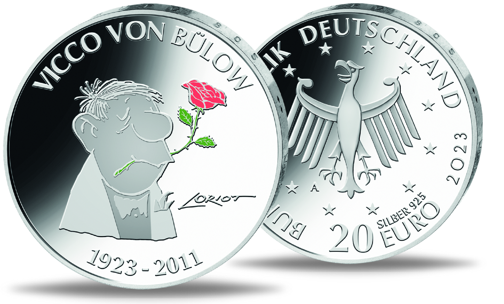 Die Bildseite zeigt den „Rosenkavalier“ und damit nicht nur eine der bekanntesten Zeichnungen Vicco von Bülows. Vielmehr handelt es sich geradezu um eine ikonische Figur, die Loriot oft als besonderes Geschenk neben Autogrammen skizzierte. Die Münze setzt die Farbigkeit der Rose überzeugend neben das zart angedeutete Relief des Brustbilds. Die Umschrift nennt Namen und Lebensdaten des Geehrten. Das Porträt schwebt frei auf dem Münzgrund. Subtiler Humor trifft in der gewählten Umsetzung eindrucksvoll auf den surrealen Charme im Werk des Humoristen. Gestaltet wurde die Bildseite vom Studio Loriot und der Staatlichen Münze Berlin