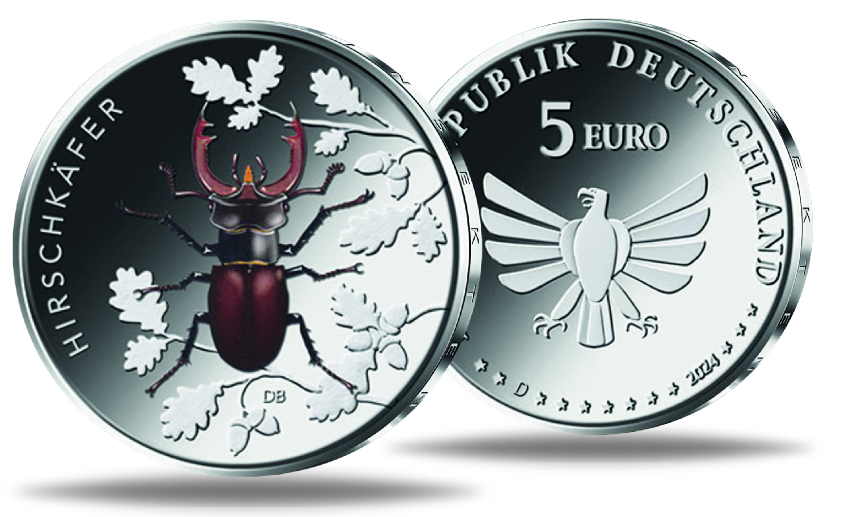 Die achte Ausgabe der 5-Euro-Serie ist dem Hirschkäfer gewidmet, der im Jahr 2012 zum „Insekt des Jahres“ gewählt wurde. Er ist in Laub- und Mischwäldern beheimatet und gehört mit einer Größe von bis zu 8 cm und seinen geweihartig vergrößerten Mandibeln, denen der Käfer seinen Namen verdankt, zu den größten und auffälligsten Käfern in Europa. Da er bei der Zersetzung von Totholz hilft und somit zur Aufrechterhaltung eines gesunden Waldbiotops beiträgt, übernimmt er eine wichtige ökologische Funktion.