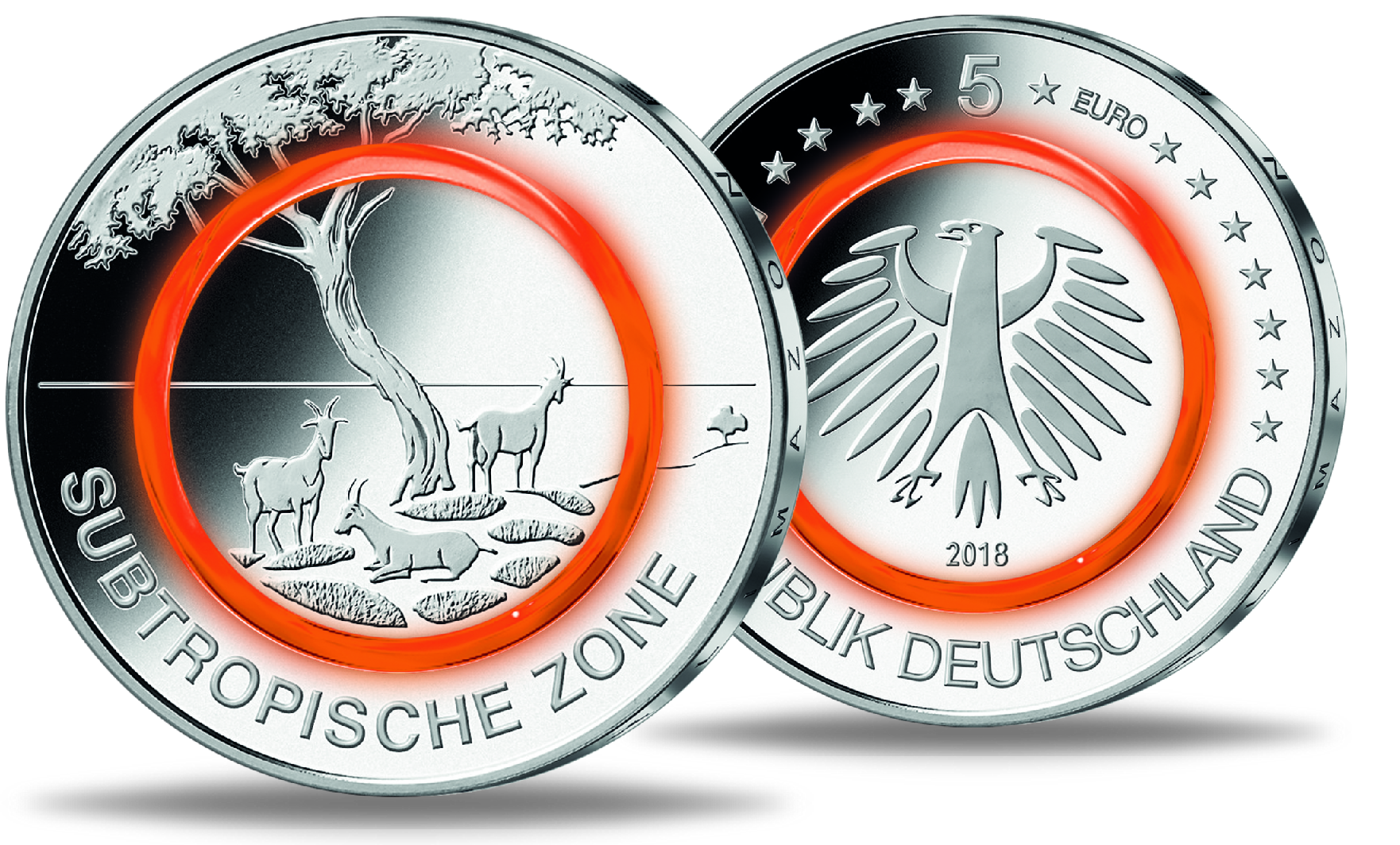 Der Entwurf der Bildseite der „Subtropischen Zone“ stammt von dem Künstler Patrick Niesel aus Schwaig. Der Polymer-Münzkern bildet eine Ziegenweide ab, welche die vorherrschende Flora und Fauna perfekt wiederspiegelt. Der abgebildete Baum steht hierbei stellvertretend für eine Vielzahl an Arten mit einer Schirmkrone, wohingegen die Ziegen samt der Strauchlandschaft den Charakter der Subtropischen Zone zutreffend und dennoch subtil untermalen.