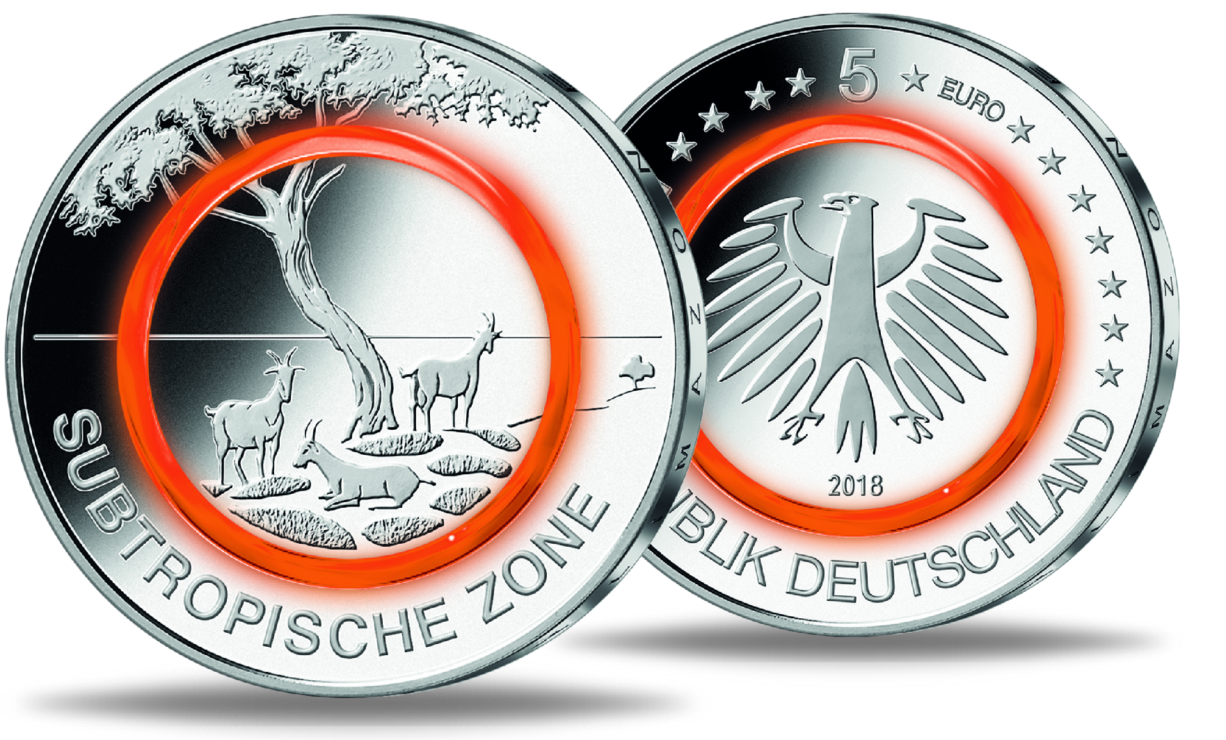 Wir finden eine solche Serie zum Thema „Klimazonen der Erde“ ist eine hervorragende Idee für Münzmotive. Die jeweiligen Polymer-Ringe zeigen ebenfalls den Fortschritt der deutschen Prägestätten und überzeugen durch Präzision und Qualität. Diese Prägetechnik ist weltweit einmalig und begeistert Sammler und Münzfreunde auf der ganzen Welt.