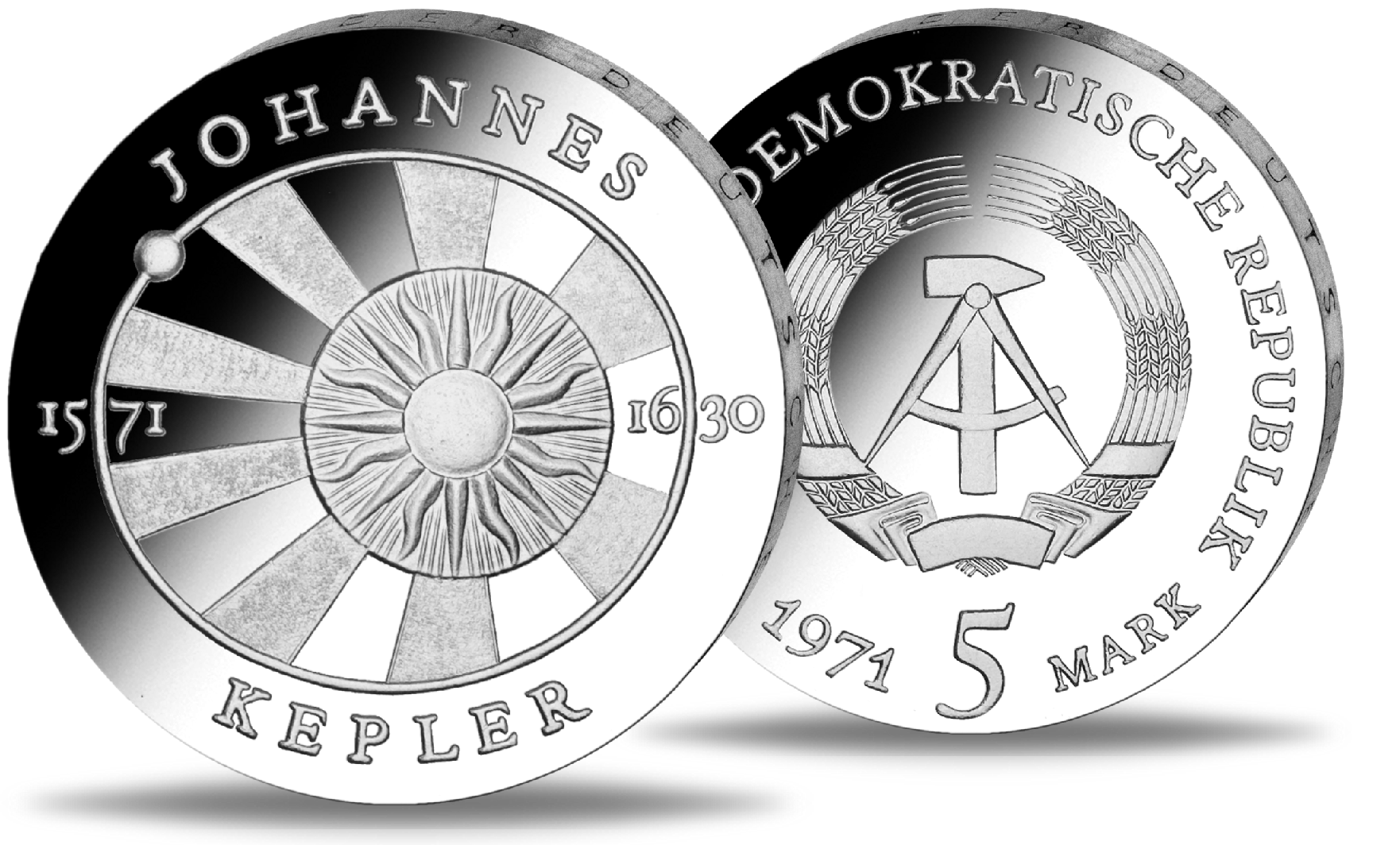 In den Jahren 1966 bis 1990 gab die DDR Gedenk- und Sammlermünzen mit mehr als 122 verschiedenen Motiven aus. Sie bestanden aus verschiedenen Legierungen mit Nennwerten von 5, 10 oder 20 Mark. Die 5 Mark-Münze aus dem Jahr 1971 gedenkt dem 400. Geburtstag von Johannes Kepler. Kepler wurde 1571 in Regensburg geboren und war ein deutscher Naturphilosoph, Astronom, Astrologe, Mathematiker und evangelischer Theologe. Er entdeckte zum einen die Gesetze der Planetenbewegung, die daraufhin nach ihm in „Keplersche Gesetze“ benannt wurde.