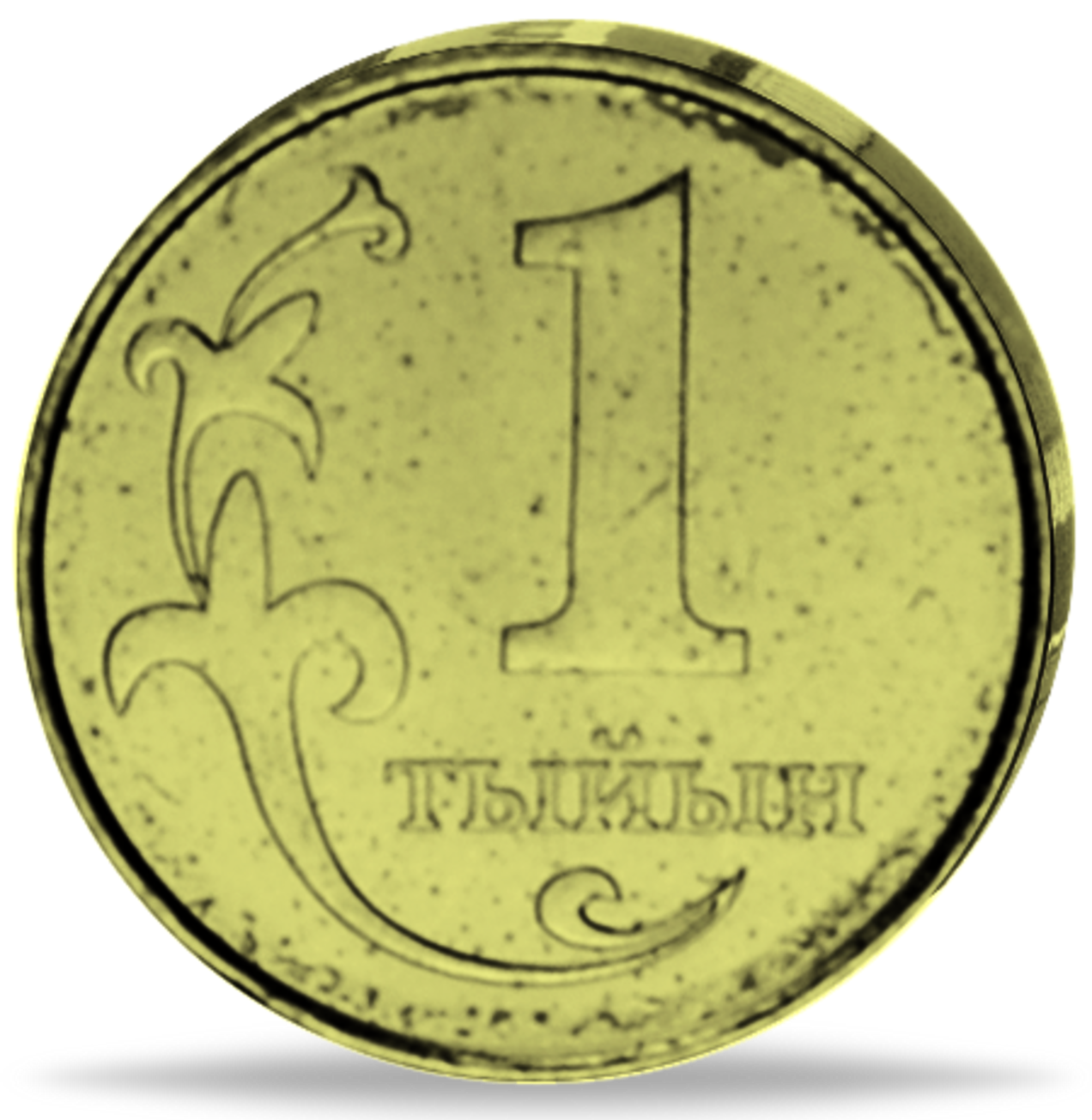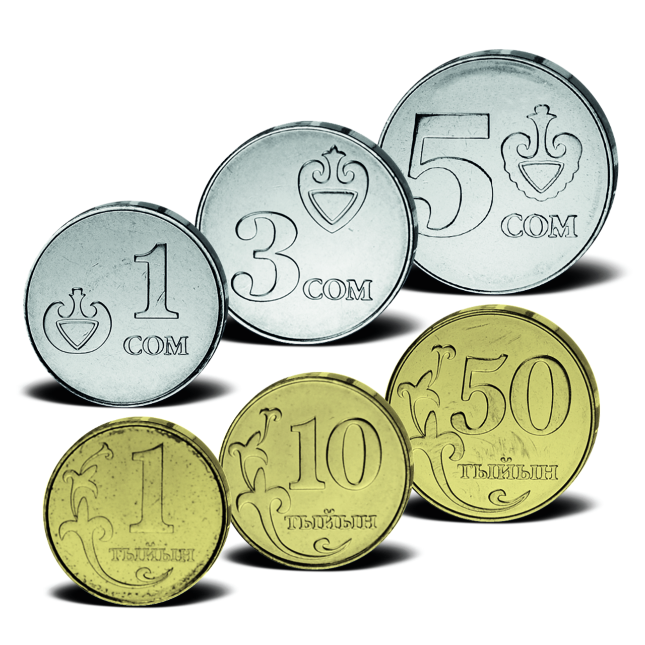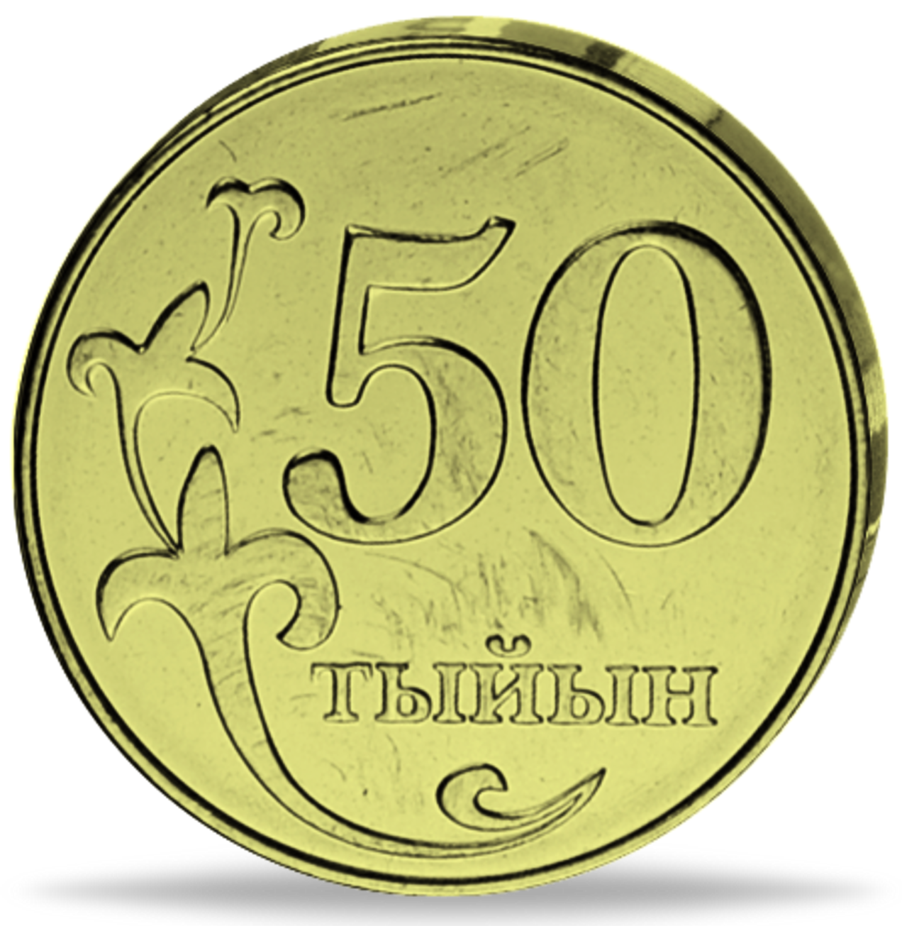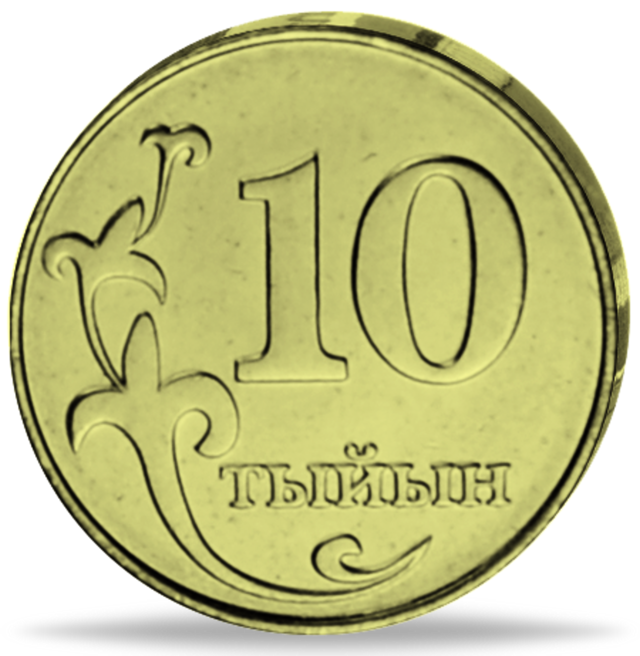 | Nominale bei Setartikeln: | 1, 10, 50 Tyjyn, 1, 3 und 5 Som |
