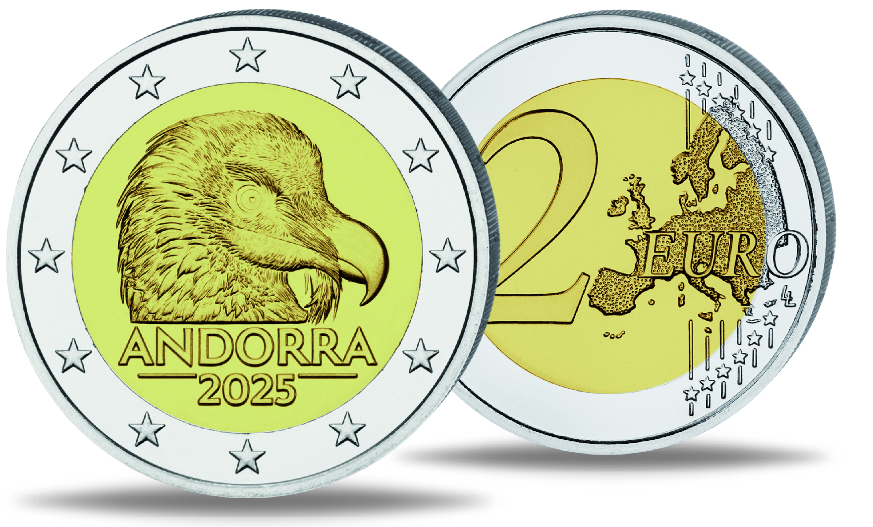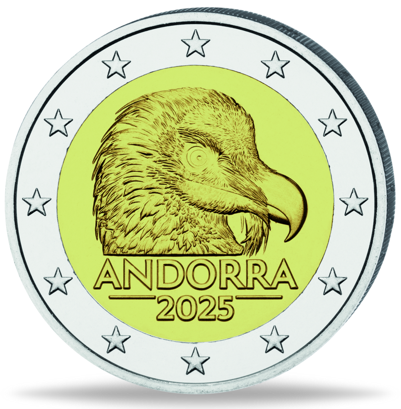 Auf ihrer Motivseite präsentiert die Münze zentral das Kopf-Portrait eines nach rechts blickenden Bartgeiers vor einem schlichten Hintergrund. Die Darstellung präsentiert sich äußerst detailliert und ausdrucksstark. Unterhalb des Kopfes steht plakativ der Schriftzug „ANDORRA 2025“ und vervollständigt gekonnt das Design.