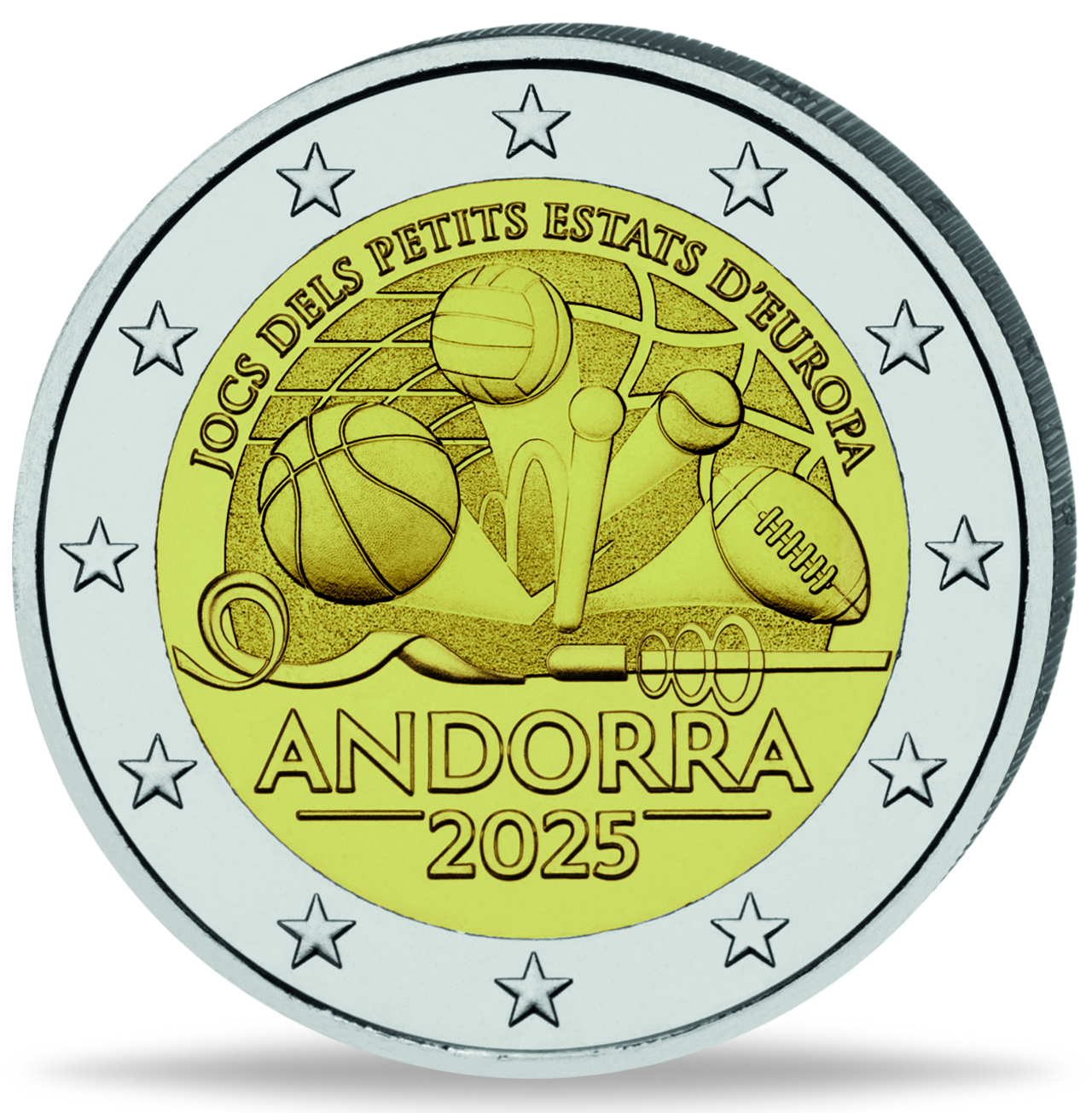 Diese 2-Euro-Gedenkmünze des Jahres 2025 aus Andorra ist den Spielen der kleinen Staaten Europas (GSSE) gewidmet, die Ende Mai im Fürstentum ausgetragen werden. Die Münze, geprägt von der renommierten Monnaie de Paris, erscheint in bester bankfrischer Qualität und wird originalverpackt in einer offiziellen Coincard geliefert.