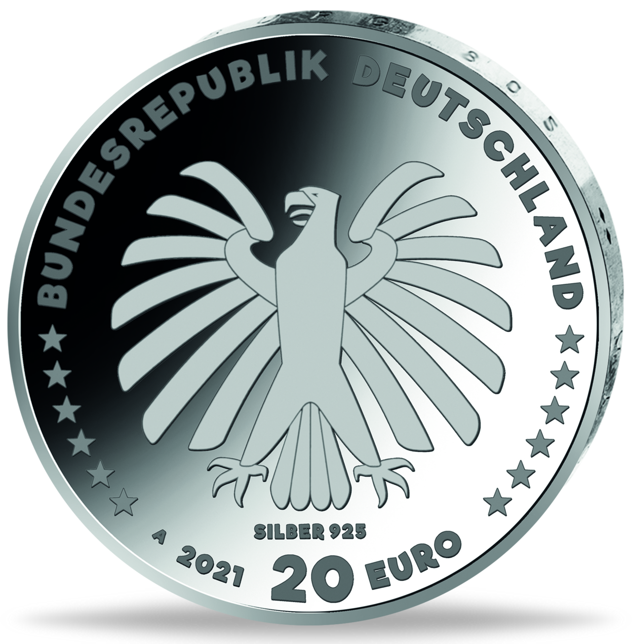 | Revers: | „BUNDESREPUBLIK DEUTSCHLAND“, Wertziffer und Wertbezeichnung, das Prägezeichen „A“ der Staatlichen Münze Berlin, die Jahreszahl 2021 sowie die zwölf Europasterne. Zusätzlich ist die Angabe „SILBER 925“ aufgeprägt. |