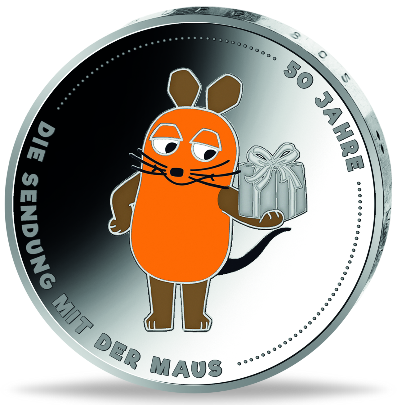 Auf ihrer Motivseite, entworfen von der WDR mediagroup GmbH/Staatliche Münze Berlin, präsentiert die Gedenkmünze mit einem beachtlichen Durchmesser von 32,5 Millimetern die beliebte Maus in ihrer charakteristischen knallorangenen Farbe. Stolz hält sie ein Präsent in der Hand, das sie neugierig betrachtet. Umlaufend ist der Schriftzug „50 JAHRE ····DIE SENDUNG MIT DER MAUS····“ zu sehen.