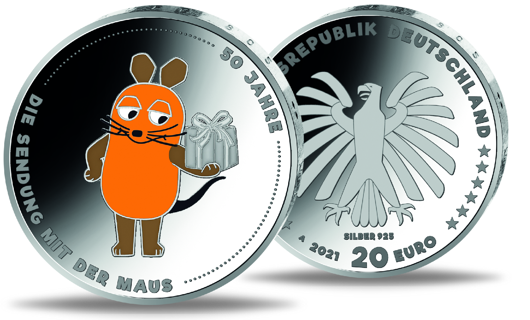 Anlässlich dieses Jubiläums hat die Münze Deutschland diese eindrucksvolle 20-Euro-Münze aus Silber und mit hochwertiger Farbapplikation geprägt. Sie ist in den Prägequalitäten „Stempelglanz“ und „Polierte Platte“ erhältlich. Feiern Sie mit uns den 50. Geburtstag der wissbegierigen Maus und bestellen Sie die Silbermünze am besten sofort, bevor sie vergriffen ist!