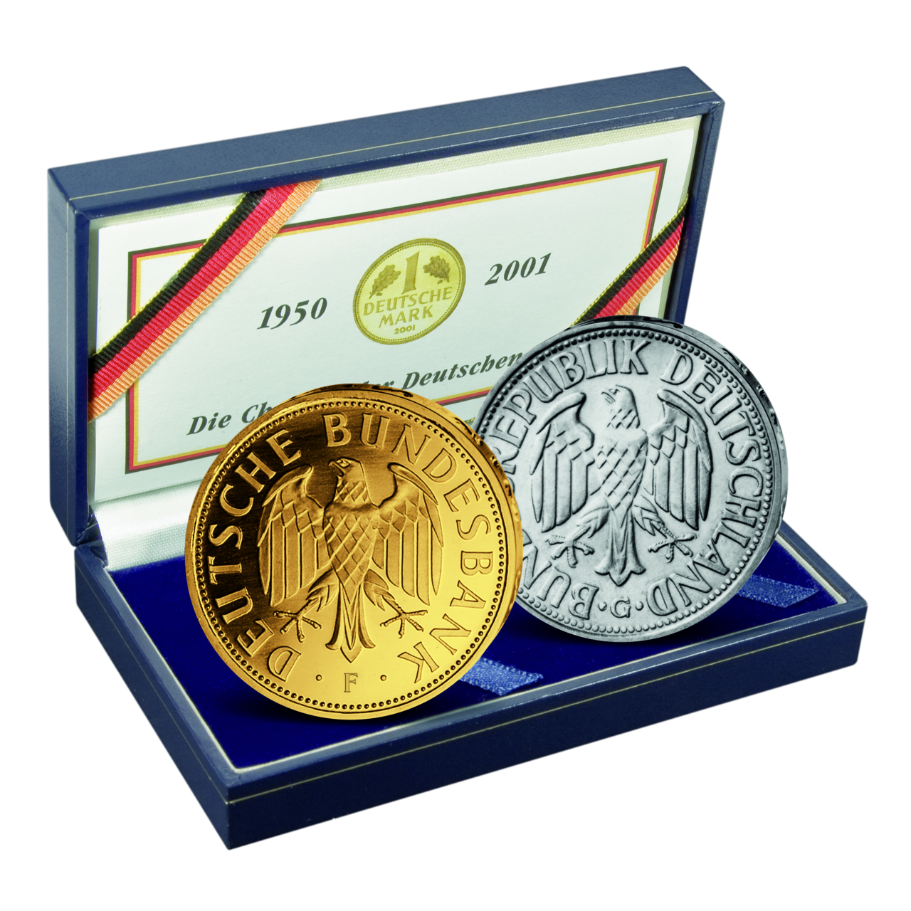 Bundesrepublik Deutschland, Set 1 Goldmark 2001 + 1 DM 1950 + Buch der größten deutschen Reden - Gol