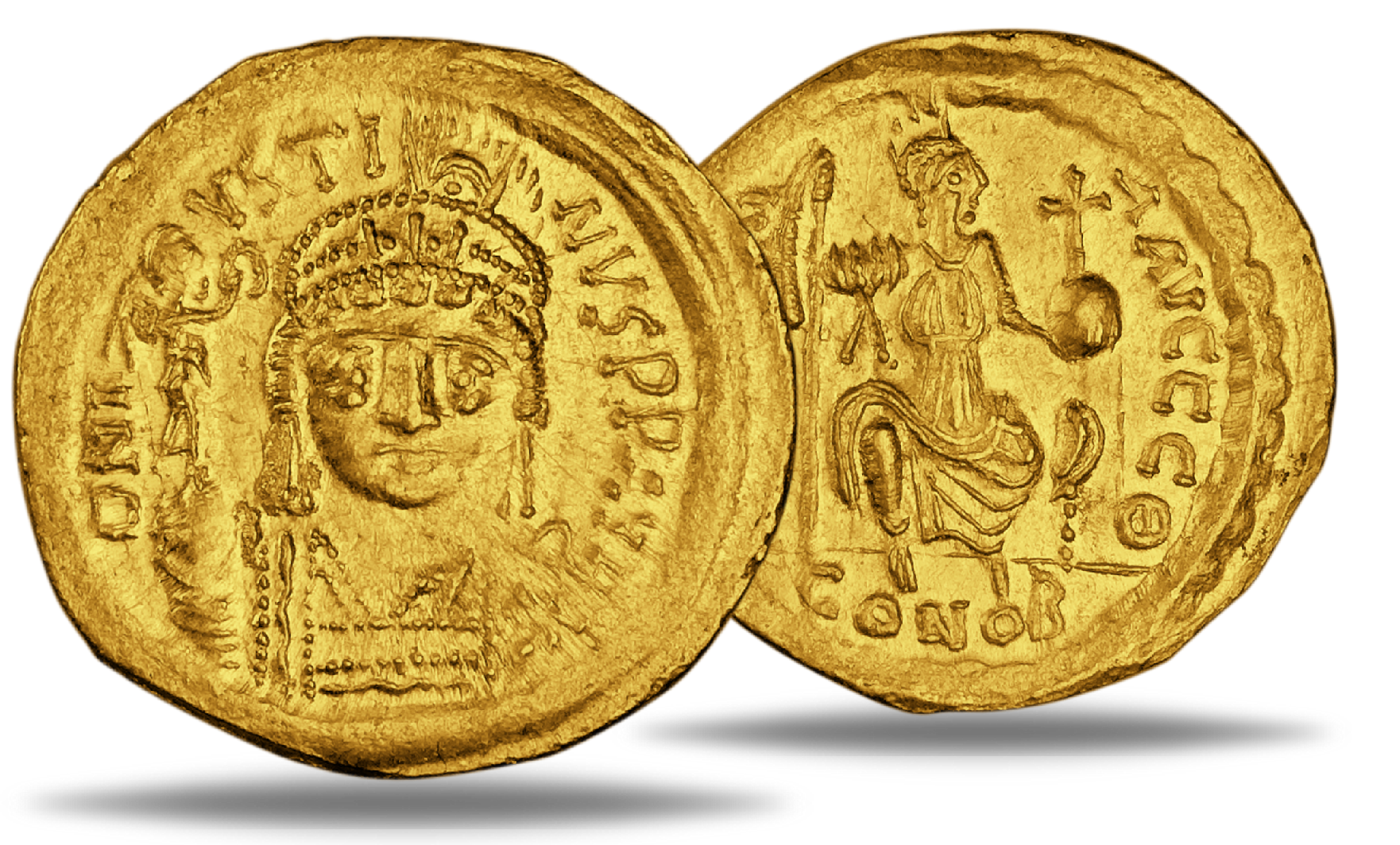 Kaiser Justin II., Flavius Iustinus, war der Neffe von Justinian I. und herrschte 565-578. Allerdings wurde er nicht zum Caesar designiert. Seine Außenpolitik war von Krisen bestimmt: Die Langobarden fielen in Italien ein und der Krieg mit den persischen Sassaniden brach wieder aus. Das Bündnis mit den Kök-Türken hielt nicht, was er sich versprach. Stattdessen wandten sie sich gegen Ostrom und nahmen die Krim ein. Zudem brach die Pest aus. Gleichzeitig setze sich Justin II. für religiöse Toleranz ein und machte Zugeständnisse. Die Stadthalter der Provinzen sollten nun nicht mehr vom Kaiser, sondern von örtlichen Bischöfen eingesetzt werden. Seine Finanzpolitik galt als umsichtig und gelungen. Justin II. erkrankte und sein erfolgreicher General Flavius Tiberius Constantinus wurde zu seinem Mitkaiser und späteren Nachfolger. Der Avers zeigt Justin II. mit einem Perlen und Bändern geschmückten Helm, einem Pendilien. Er hält Viktoria auf dem Globus, die sein leicht geneigtes Haupt krönt. Die Umschrift lautet DN IVSTINVS PP AVG. Auf dem Revers sehen wir Justin II. sitzend, mit Zepter und der Weltkugel mit Kreuz.