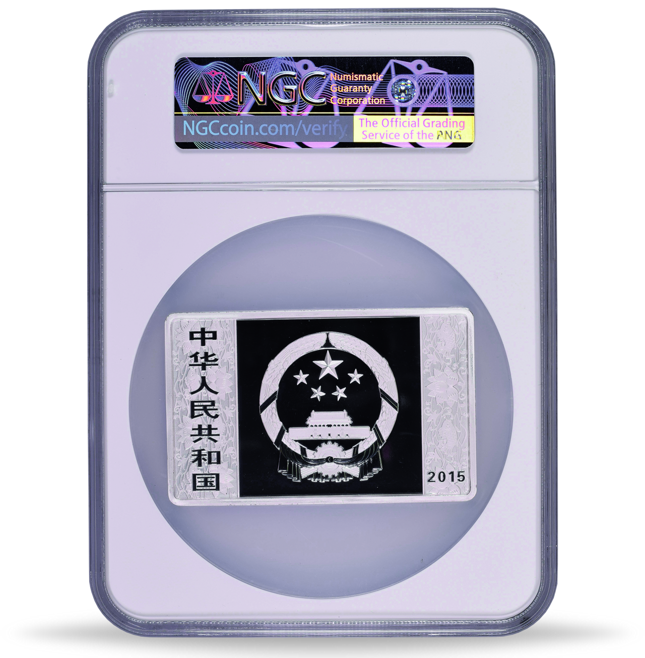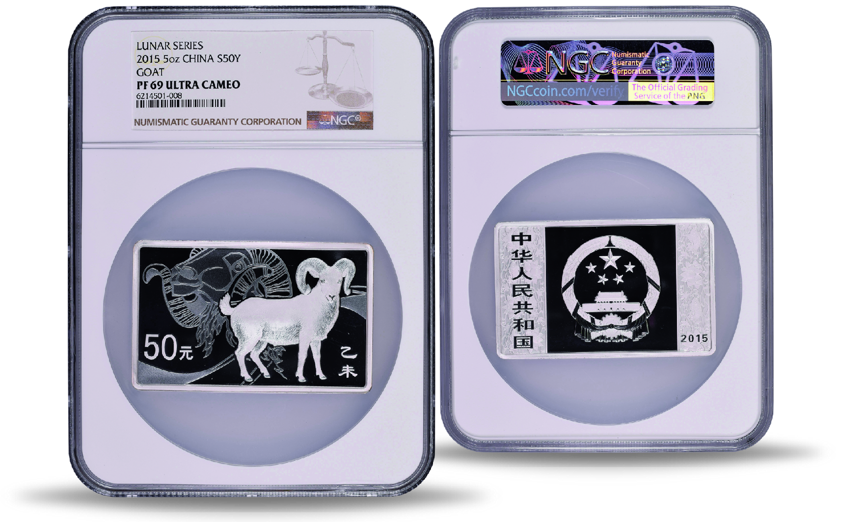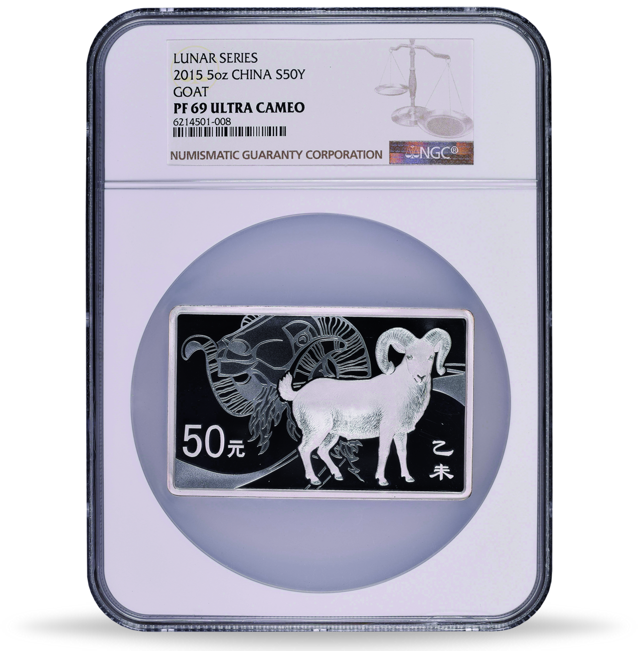 Produktinformationen "China, 50 Yuan 2015, Jahr der Ziege, Münzbarren 5 oz Silber PP - NGC PF-69 Ultra Cameo"