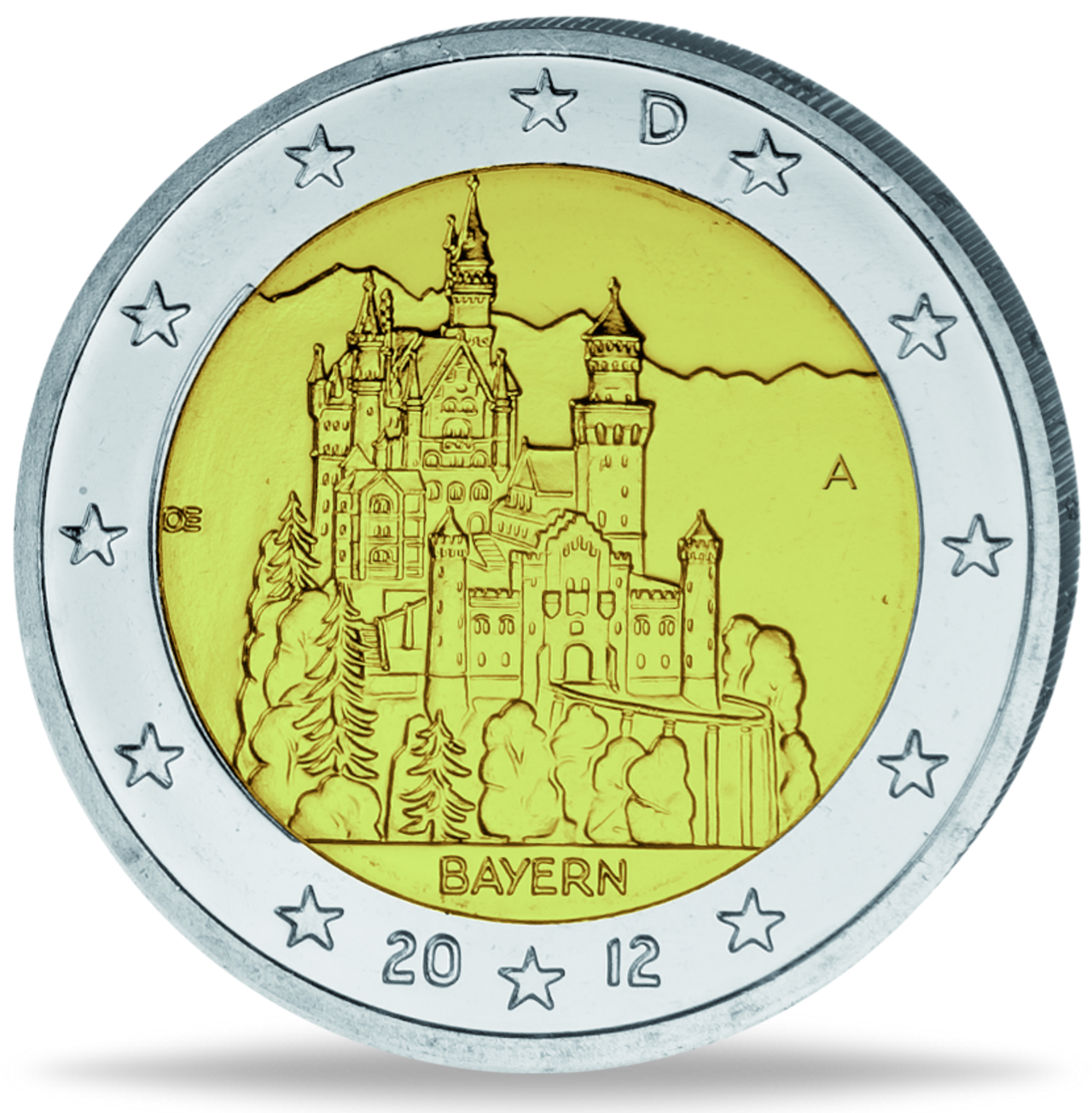 Die Auflage dieser 2-Euro-Sammlermünze beträgt etwa 30 Millionen Stück. Unter dem Motiv des Schlosses ist der Schriftzug „Bayern“ zu lesen. Die Mitte wird eingefasst von dem Banner „Bundesrepublik Deutschland“ samt den Europa-Sternen und dem Erscheinungsjahr 2012.