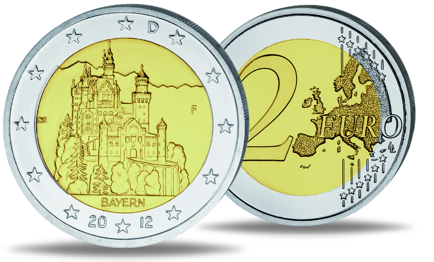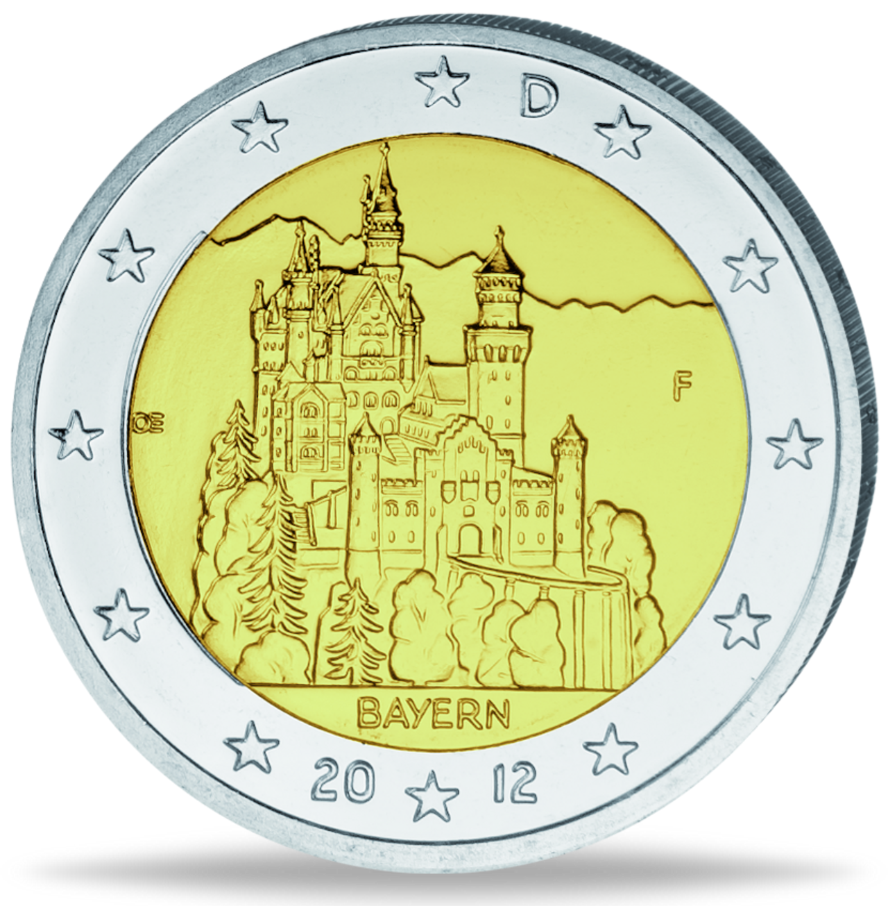 Die Auflage dieser 2-Euro-Sammlermünze beträgt etwa 30 Millionen Stück. Unter dem Motiv des Schlosses ist der Schriftzug „Bayern“ zu lesen. Die Mitte wird eingefasst von dem Banner „Bundesrepublik Deutschland“ samt den Europa-Sternen und dem Erscheinungsjahr 2012.