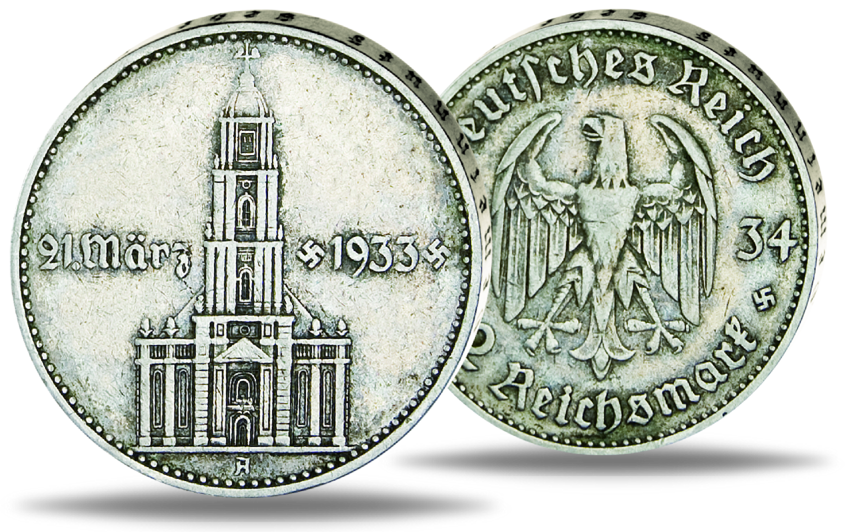 Zur Erinnerung an die Eröffnung des Reichstages erschien ein Jahr später die 2 Reichsmark-Gedenkmünze „Garnisonkirche“. Die „Garnisonkirche“ ist die erste Silbermünze des III. Reiches und trägt als einzige das Datum „21. März 1933“. Sie ist ein echter Zeitzeuge aus einer der schicksalhaftesten Epochen der deutschen Vergangenheit und besitzt eine große historische Bedeutung.