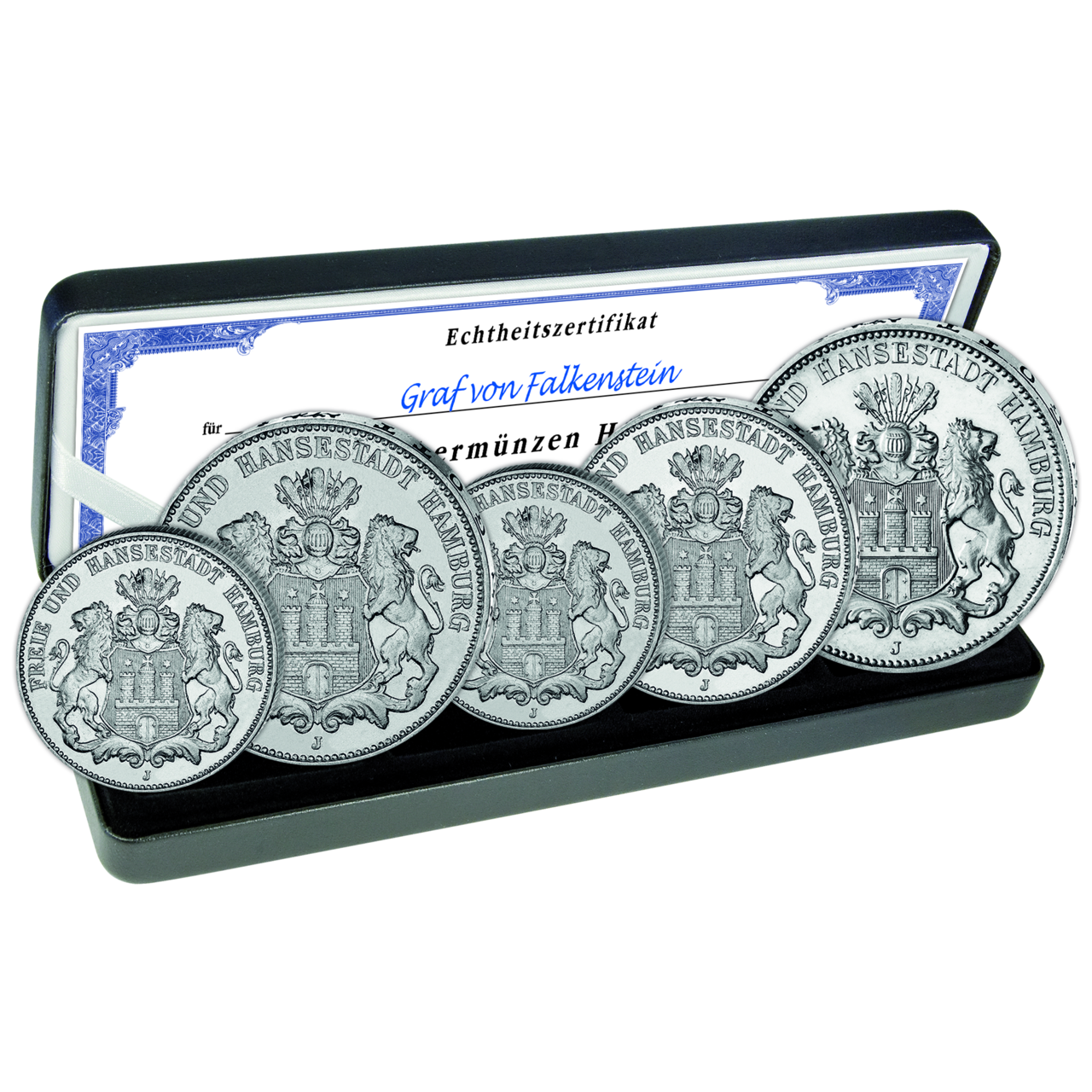 Die Münzen dieser Kollektion befinden sich in der ausgesuchten Top-Erhaltung „sehr schön / vorzüglich“ und werden im edlen Etui mit Echtheitszertifikat geliefert. So erhalten Sie nicht nur fünf historische Originale, sondern auch ein eindrucksvolles Gesamtkunstwerk aus Silber und hanseatischer Geschichte – ein echtes Juwel für jede Münzsammlung!