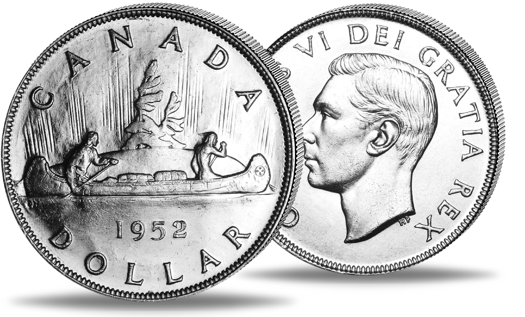 Trägt durch das Motiv auch den Namen „Voyageur Dollar“: Kanu mit einem „Voyageur“ (franz. Reisender), der von einem Ureinwohner begleitet wird !