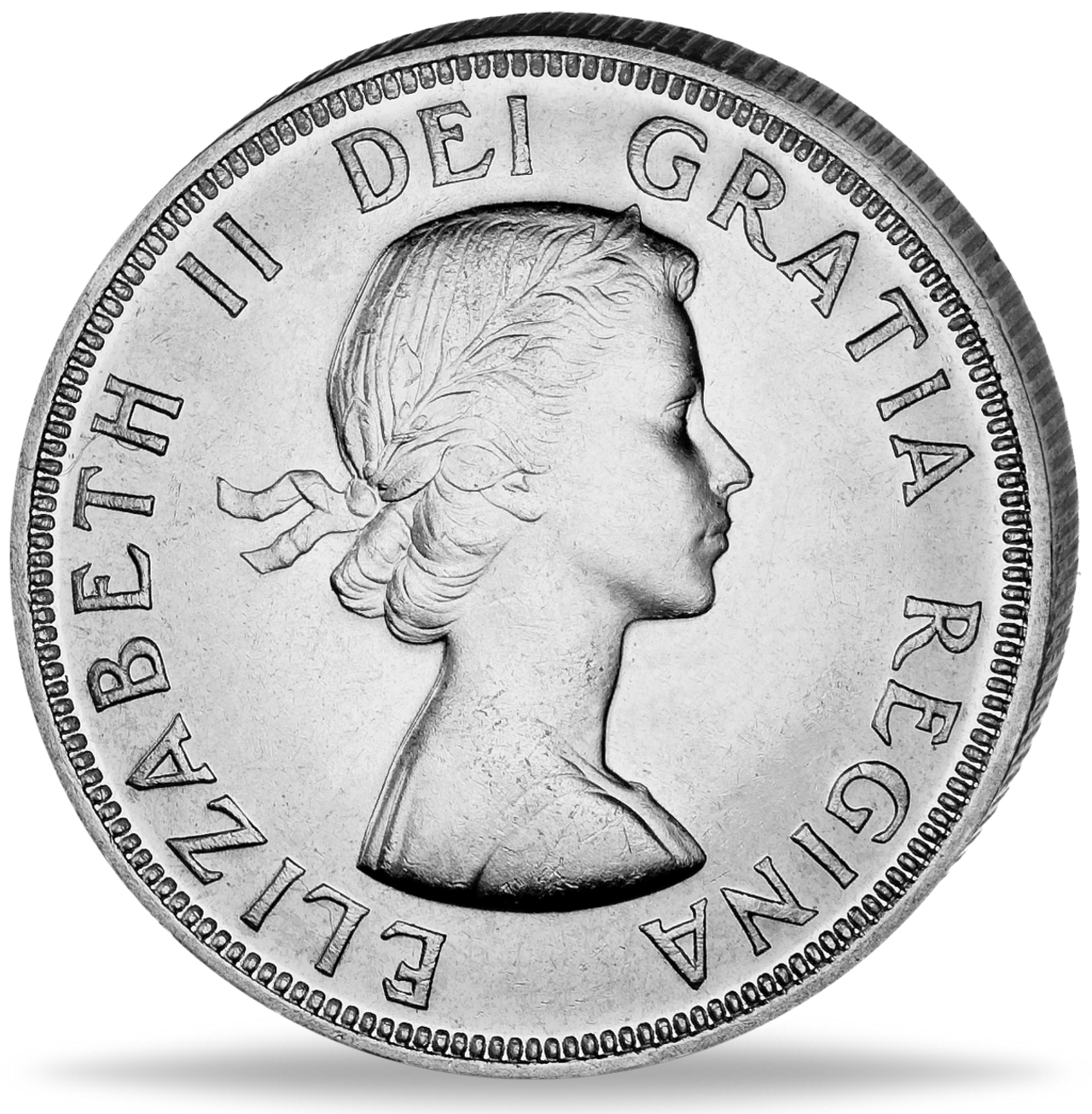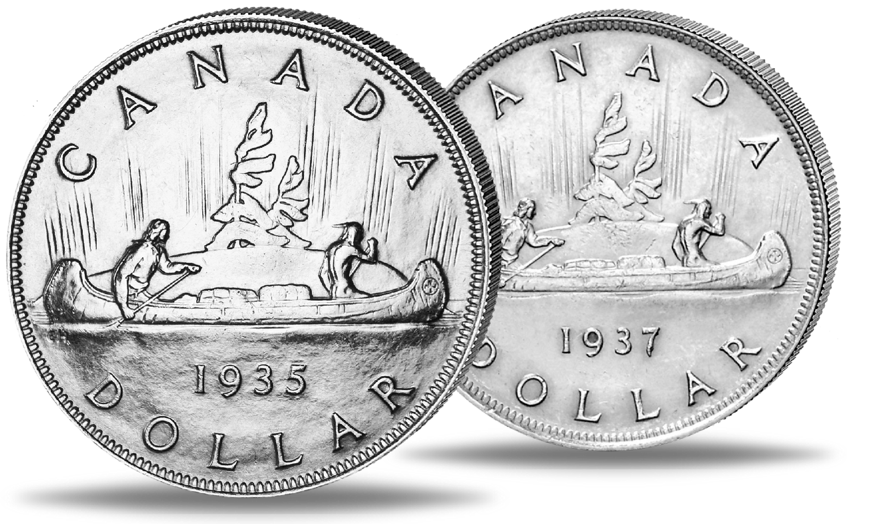 Trägt durch das Motiv auch den Namen „Voyageur Dollar“: Kanu mit einem „Voyageur“ (franz. Reisender), der von einem Ureinwohner begleitet wird !