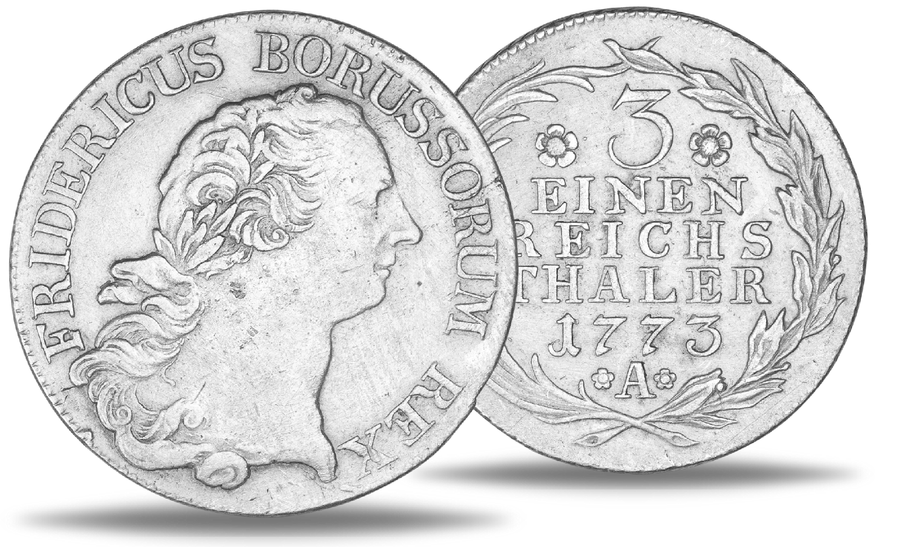 Auf der Vorderseite der historischen Silbermünze ist das Portrait von König Friedrich II. zu sehen.