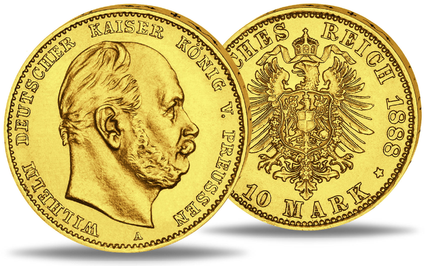 Die Vorderseite der historischen Goldmünze zeigt ein Portrait des Kaisers Wilhelm I. Die Rückseite ziert das Wappen des Deutschen Reiches.