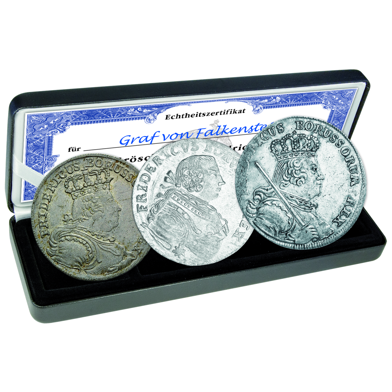 Die drei Silbermünzen werden Ihnen in einer edlen Kassette geliefert, zusammen mit einem Echtheitszertifikat, das die historische Authentizität des Satzes bestätigt. Es handelt sich um ein außergewöhnliches Sammlerstück mit großer Bedeutung für Liebhaber preußischer Geschichte, Numismatikfreunde und alle, die den Wert echter Zeitzeugen zu schätzen wissen.