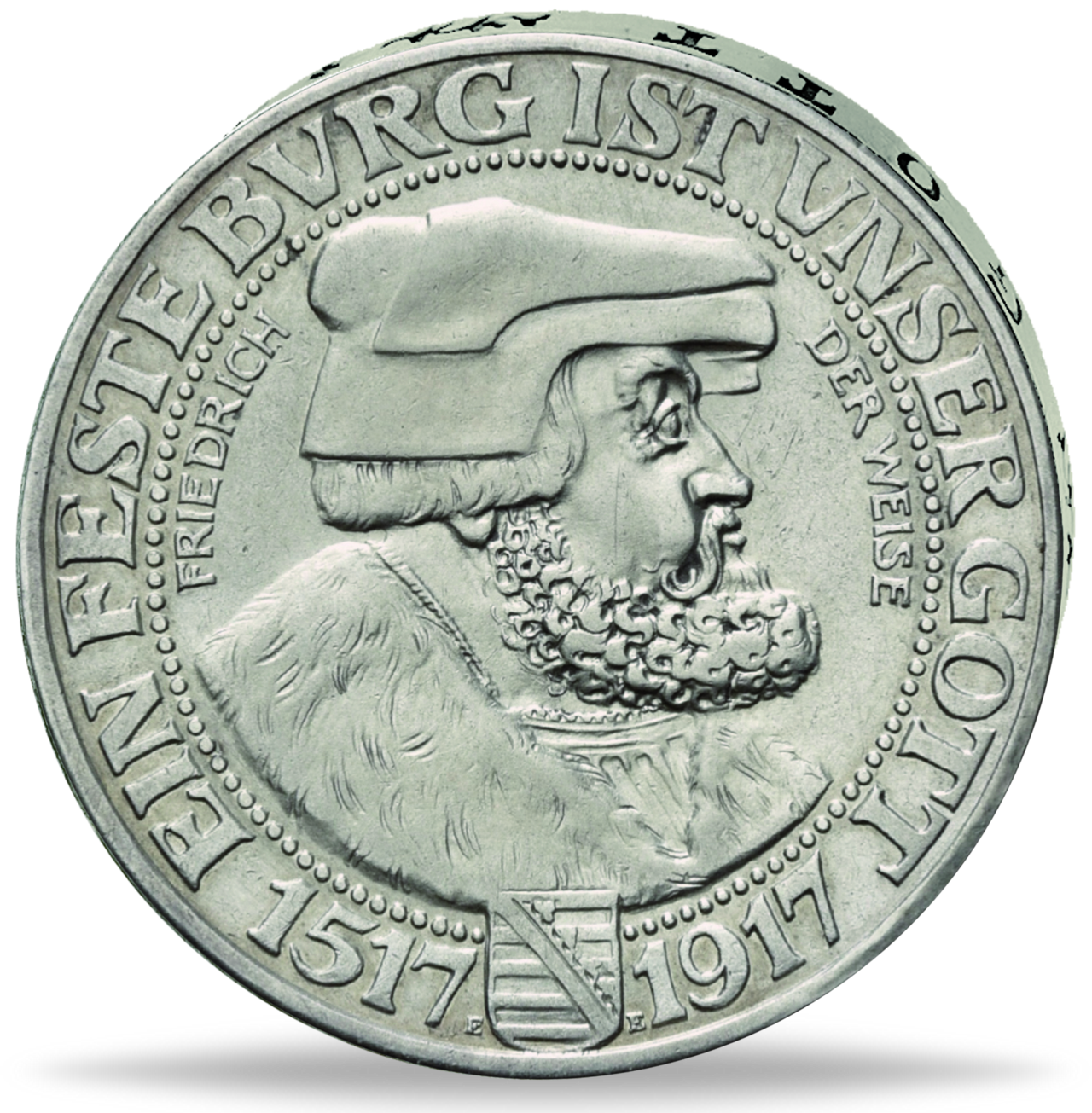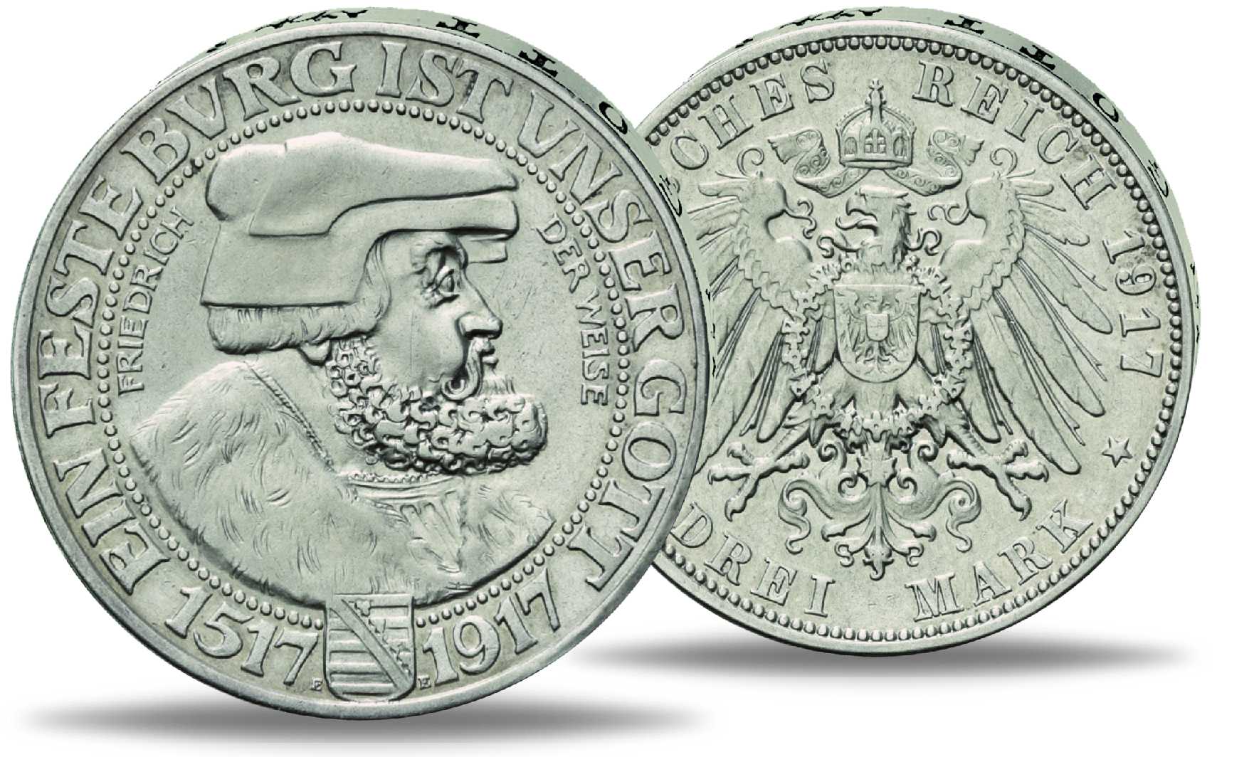 Zum 400-jährigen Reformationsjubiläum des Königreichs Sachsen wurde 1917 diese Gedenkmünze aus Silber geprägt. Mitten im 1. Weltkrieg wurde die 3 Mark-Silbermünze jedoch in wesentlich geringeren Auflage geprägt als geplant.