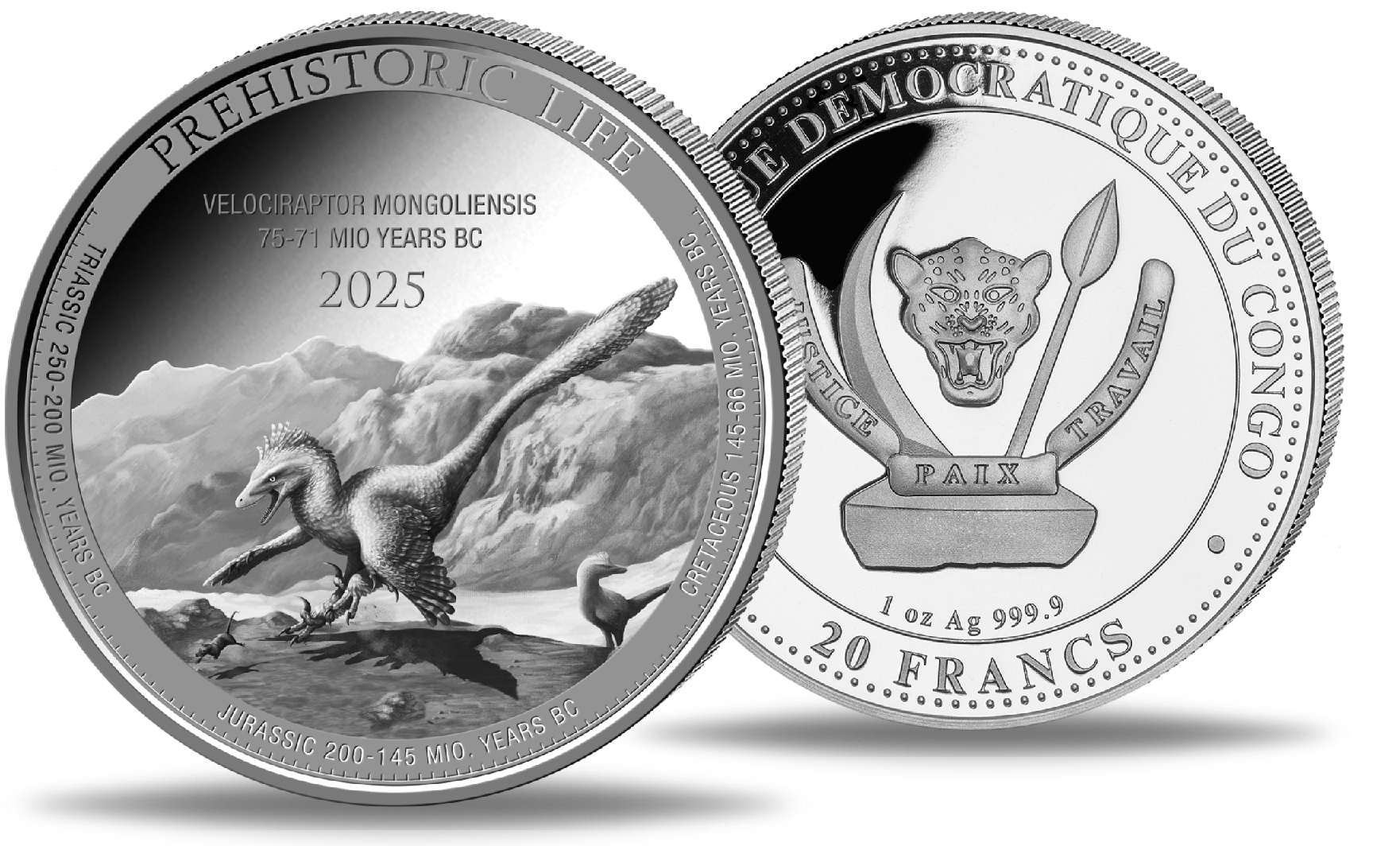 Kongo, 20 Francs 2025, Velociraptor Prehistoric Life II, 1 Unze Ag - Silber