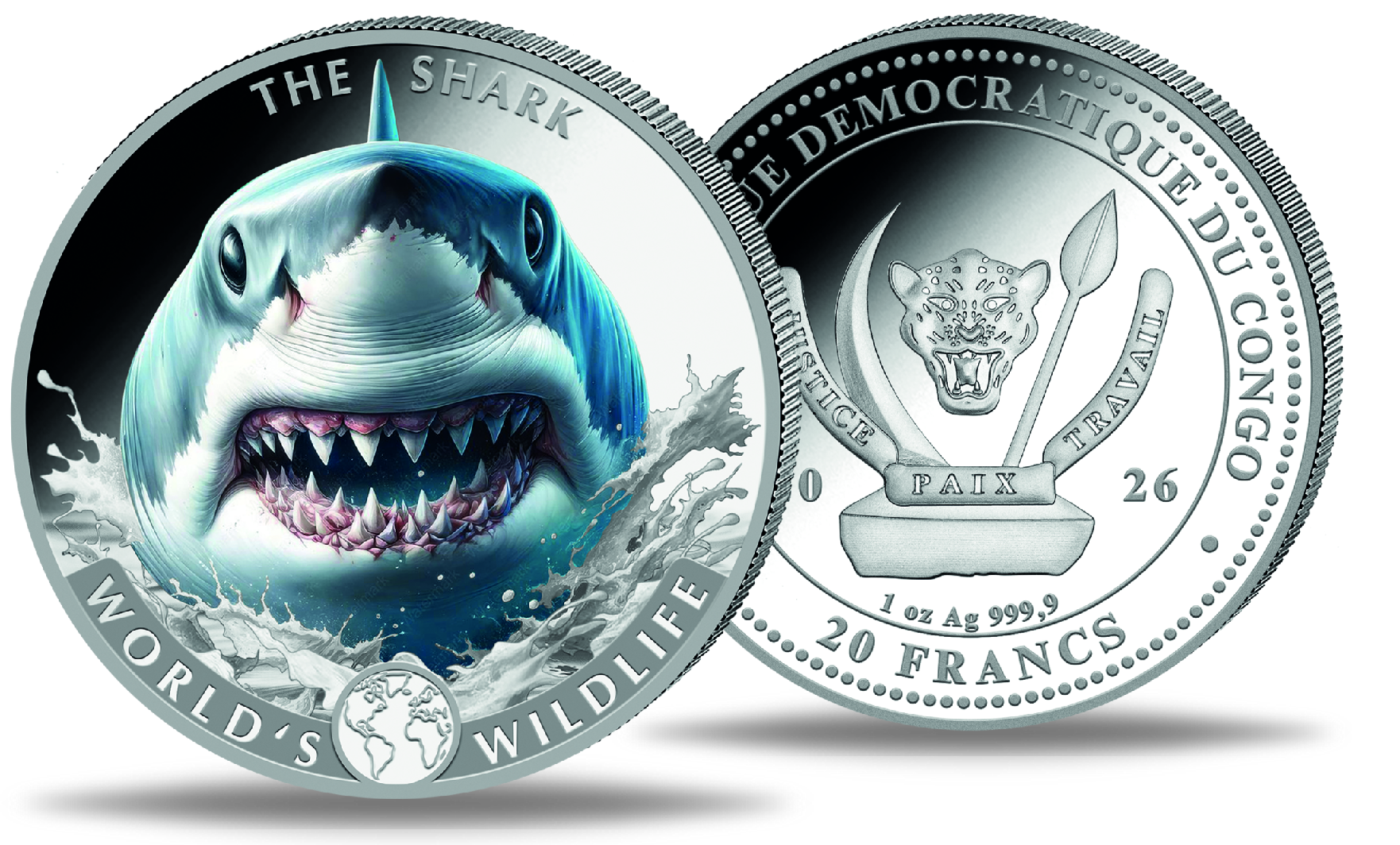 Kongo 20 Francs Hai, World´s Wildlife 1 Unze Silber mit Farbapplikation 2026