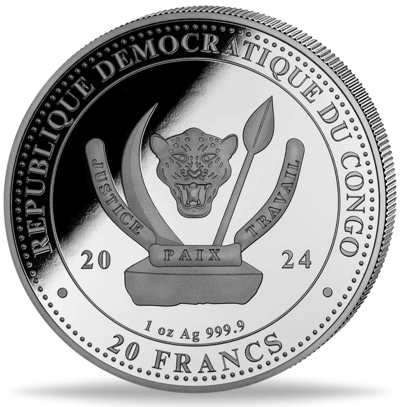 Die Rückseite dieser Münze ziert das Wappen der Republik Kongo, das den Kopf eines Leoparden, einen Elefantenstoßzahn und einen Speer zeigt. Darunter prangt das Landesmotto „Justice, Paix, Travail“ (Gerechtigkeit, Frieden und Arbeit). Die Stückelung von 1 Unze sowie die Feinheit von 999.9 sind unterhalb des Wappens zu finden. Das Prägejahr „2024“ ist kunstvoll in geteilter Optik zu beiden Seiten des Motivs eingearbeitet. Die umlaufende Inschrift „REPUBLIQUE DEMOCRATIQUE DU CONGO“ und der Nennwert von 20 Francs vollenden die Wertseite dieser einzigartigen Münze.