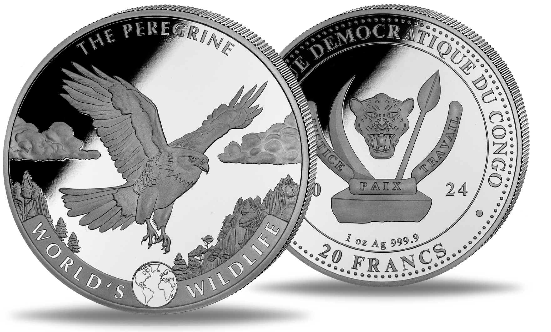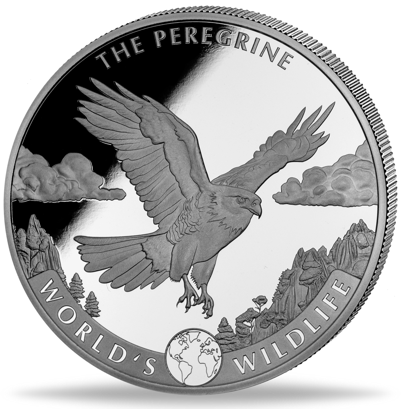 Mit einem eindrucksvollen Durchmesser von 38,6 Millimetern zeigt die Münze auf ihrer Motivseite eine äußerst detaillierte Darstellung eines Wanderfalken im Flug, während im Hintergrund Wolken und bewaldete Berge zu erkennen sind. Über dem Motiv prangt der Schriftzug „THE PEREGRINE“, während darunter der Name der Serie „WORLD'S WILDLIFE“ zu finden ist.