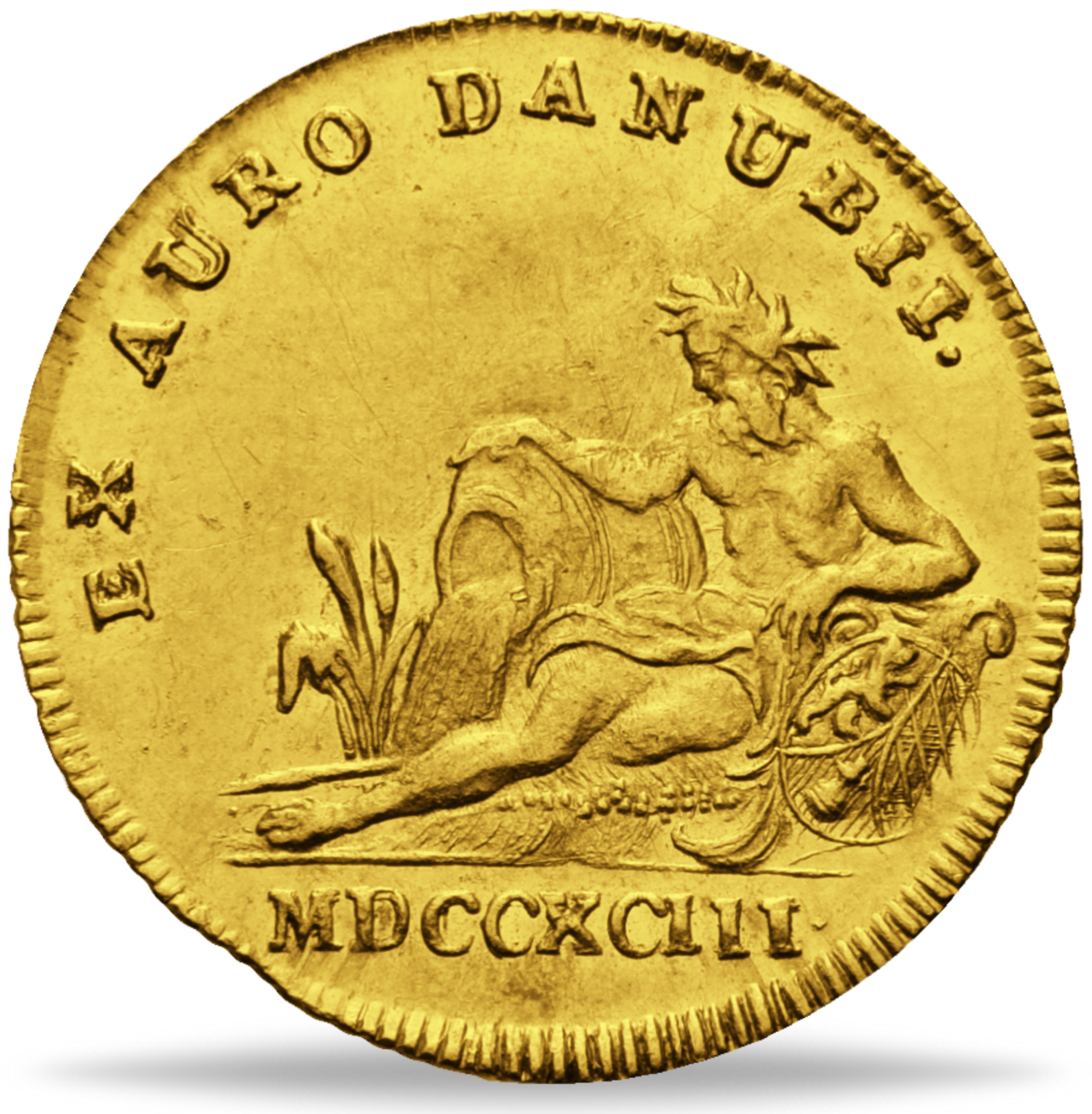 Auf der Rückseite der Donau-Flussgott mit Schilfkrone und Wappenschild sowie Umschrifft: Aus dem Gold der Donau !