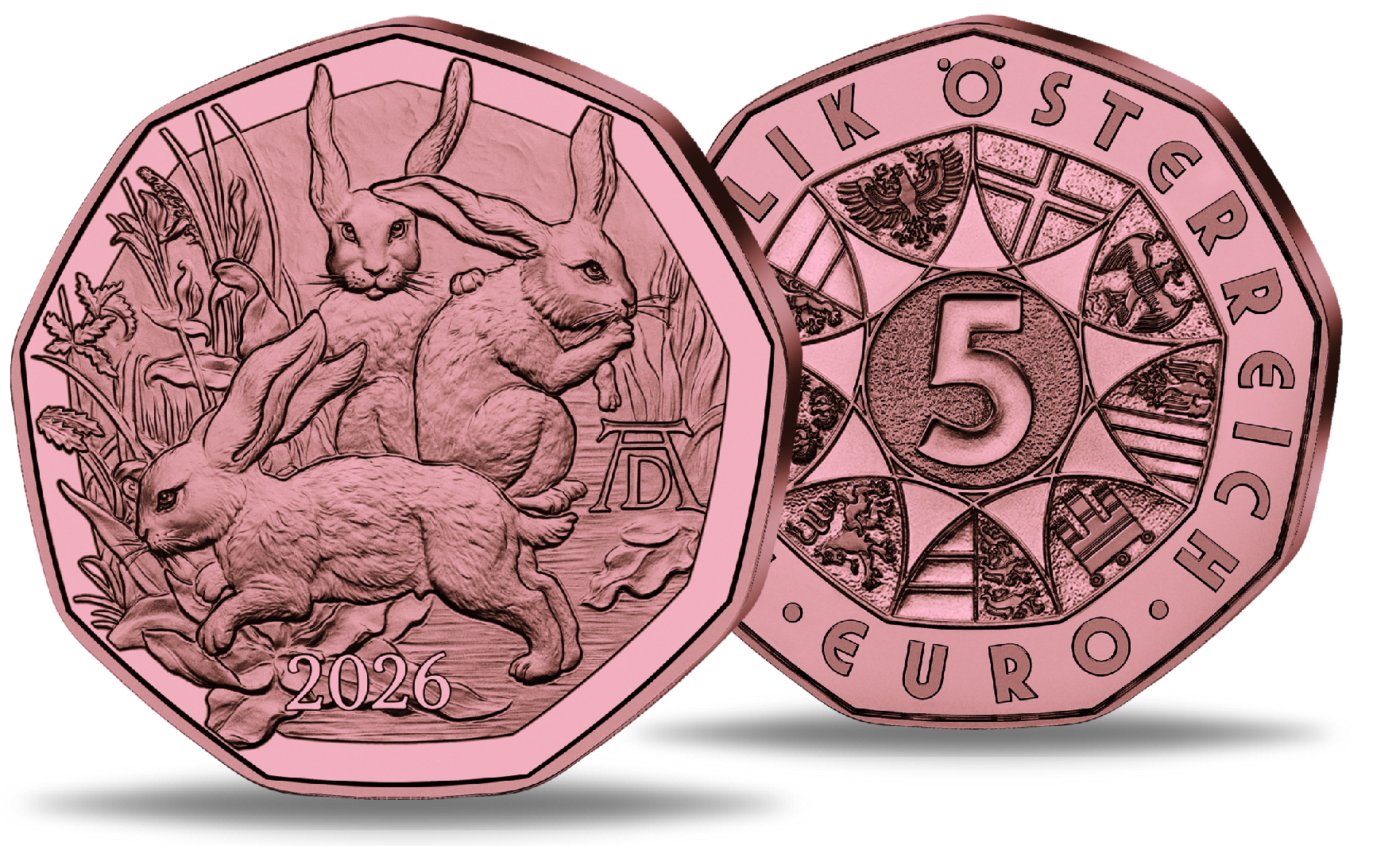 Produktinformationen "Österreich. 5 Euro Ostermünze 'Dürers Hasentrio', Kupfermünze - 2026"
