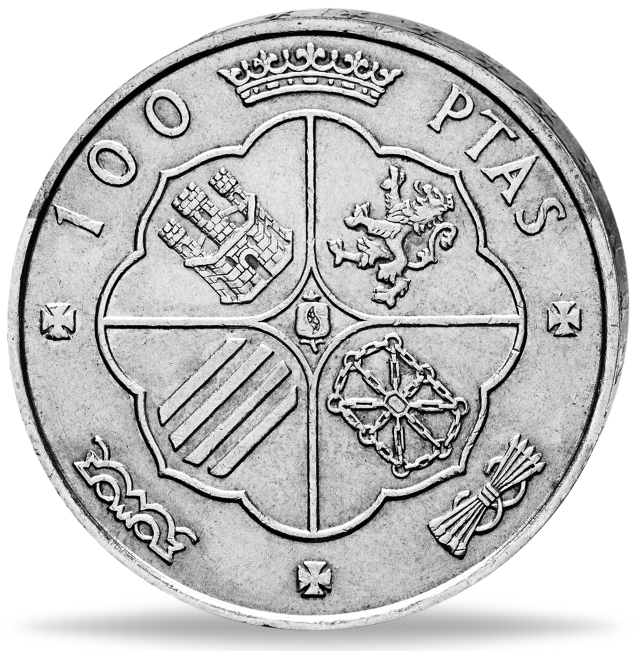 RS: Burg (Kastilien), Löwe (Leon), Paletten (Aragon), Ketten (Navarra), Granatapfel (Granada); äußere Elemente: Krone, Joch und Pfeile !