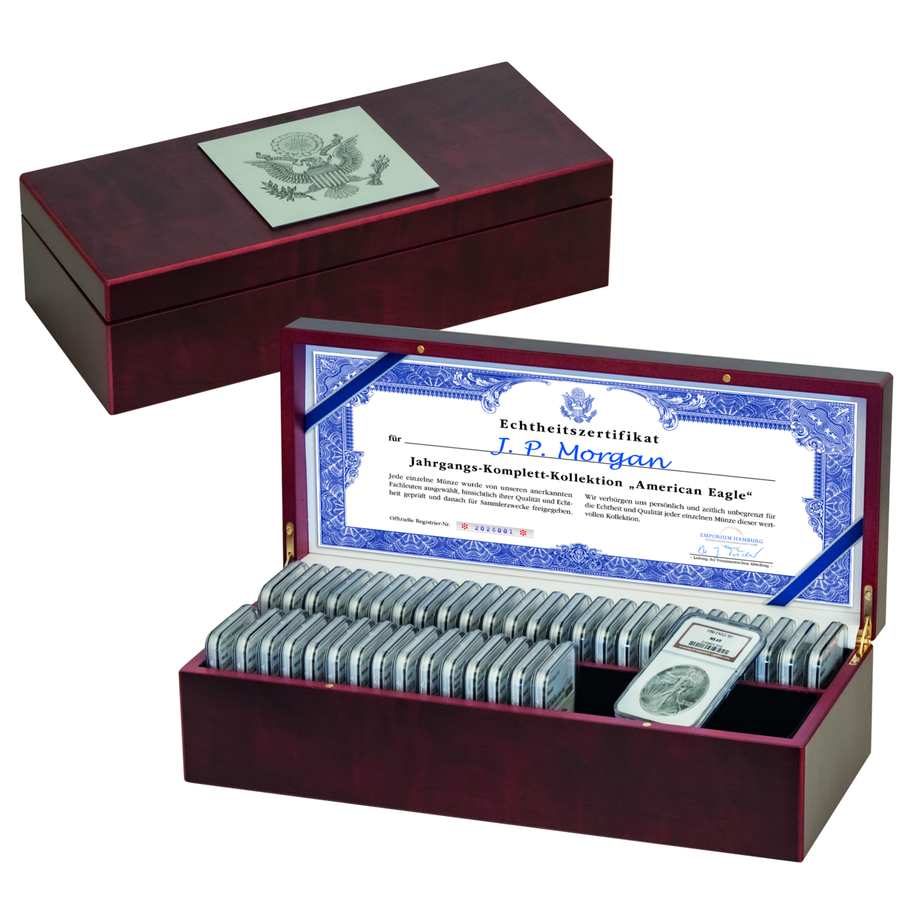 Alle 41 Silver Eagles befinden sich in offiziellen NGC-Slabs, wodurch Echtheit, Erhaltung und Wert auf höchstem Niveau gesichert sind. Geliefert werden die geslabten Silbermünzen in einer hochwertigen Holzkassette im Wert von 120 Euro, die dieser exklusiven Kollektion den passenden Rahmen verleiht und ihren außergewöhnlichen Charakter unterstreicht.