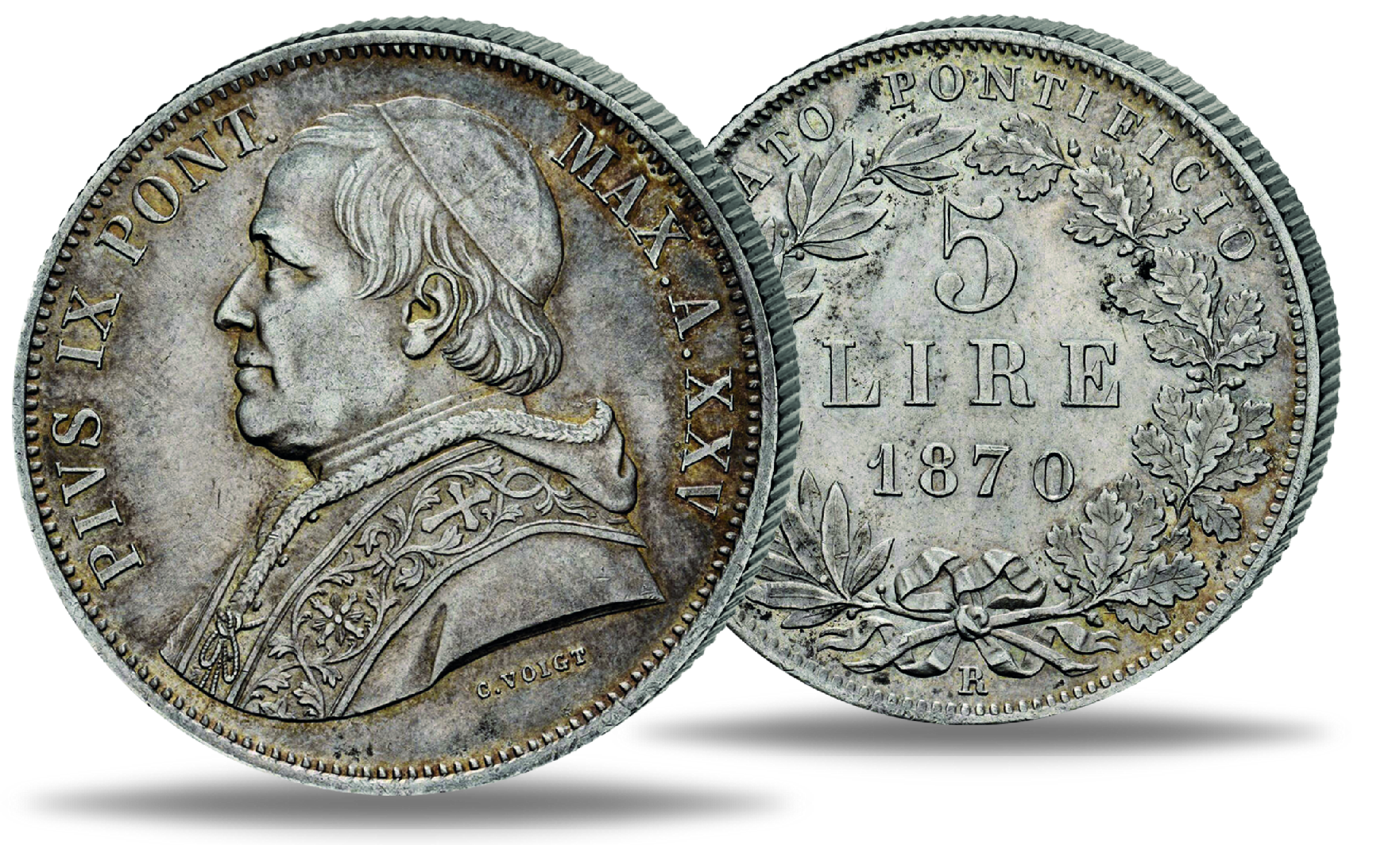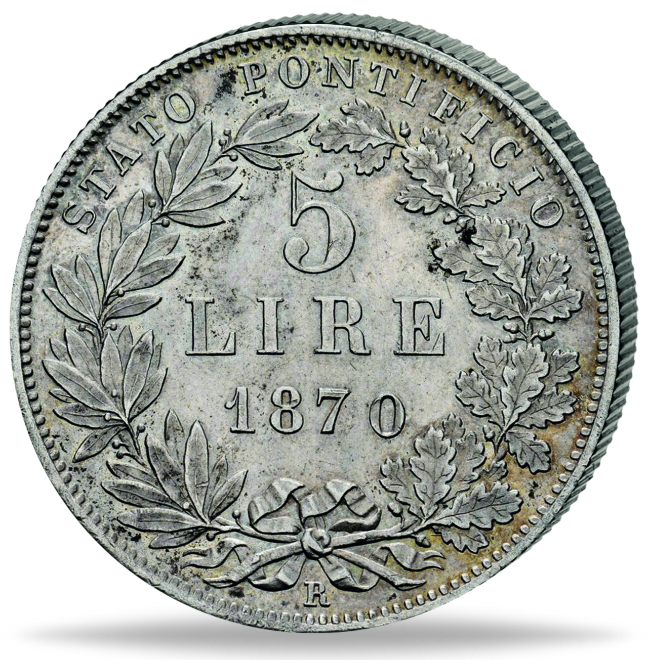 Vatikan, 5 Lire 1870 R, Papst Pius IX. - Silber