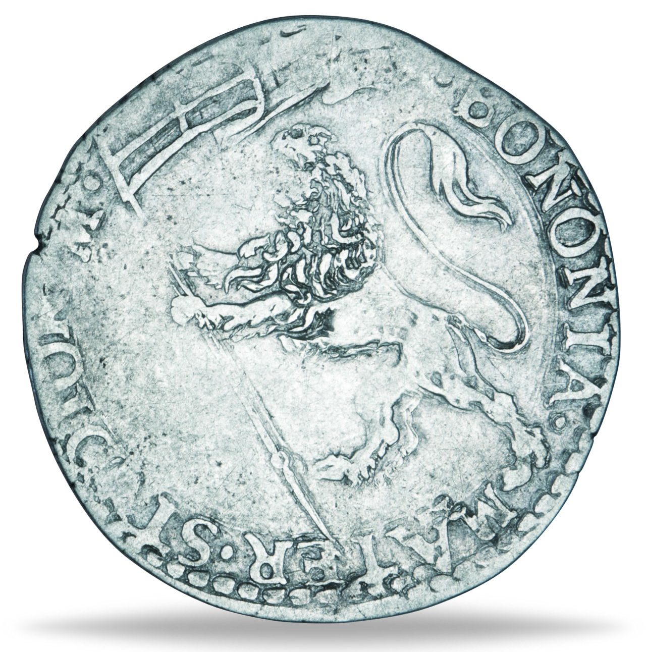 Stehender Löwe hält Fahne mit Umschrift „BONONIA MATER STVDIORVM“ (dt. Bologna Mutter der Studien) !