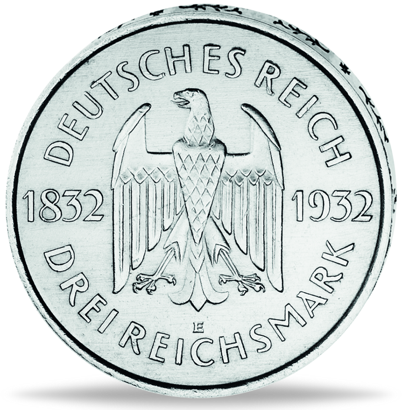Auf der letzten Silber-Gedenkmünze der Weimarer Republik ist Johann Wolfgang von Goethe zu sehen. Die Rückseite zeigt den Reichsadlerm den Jahrgang sowie das Nominal.