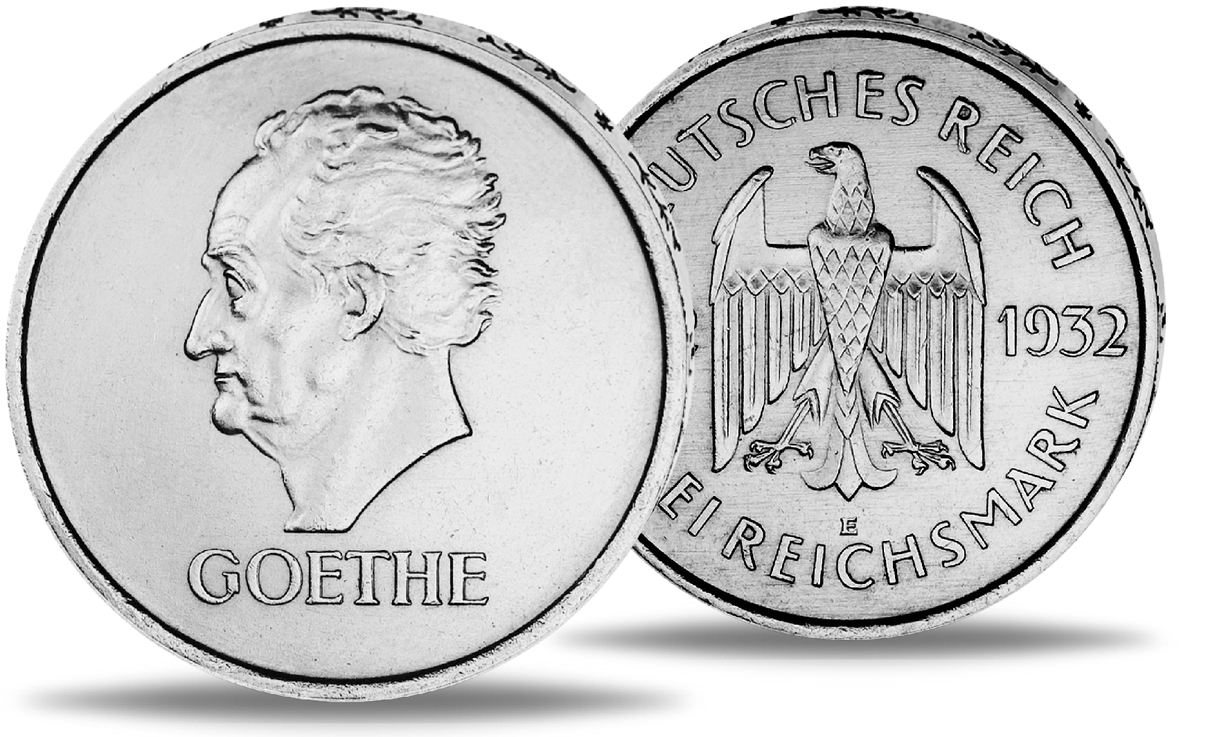 Die letzten Gedenkmünzen der Weimarer Republik wurden 1932 auf den Todestag von Johann Wolfgang von Goethe geprägt. In diesem Jahr der erbitterten politischen Kämpfe, in dem mit dem Goetheschen Erbe nicht immer verantwortungsbewusst umgegangen wurde, schuf der Medailleur Bosselt mit diesen Münzen eine schlichte und zugleich strenge Darstellung des Dichterfürsten. Sie zählt zu den schönsten deutschen Portraitmünzen. Die Monumentalität des frei im Raum stehenden Bildnisses, die auf den Lessingmünzen erkennbar wird und auf dem Dreimarkstück Stein vorgefasst ist, wird hier vollendet und so dem singularen Werk Goethes gerecht.