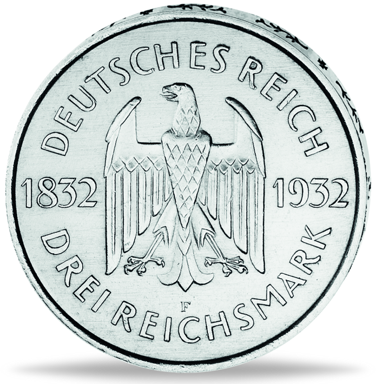 Auf der letzten Silber-Gedenkmünze der Weimarer Republik ist Johann Wolfgang von Goethe zu sehen. Die Rückseite zeigt den Reichsadlerm den Jahrgang sowie das Nominal.
