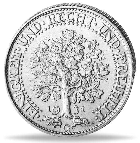 Der „Eichbaum“ – in Deutschland schon immer ein Symbol für Kraft und Standhaftigkeit – wurde als Motiv für eine ab 1927 geprägte 5 Reichsmark Kursgedenkmünze gewählt. Mit dieser Münze sollte nach der schweren Zeit der Hyperinflation auch die Aufbruchstimmung im Volk abgebildet werden: Die Menschen erlebten mit dem Wirtschaftsaufschwung eine neue Zuversicht.