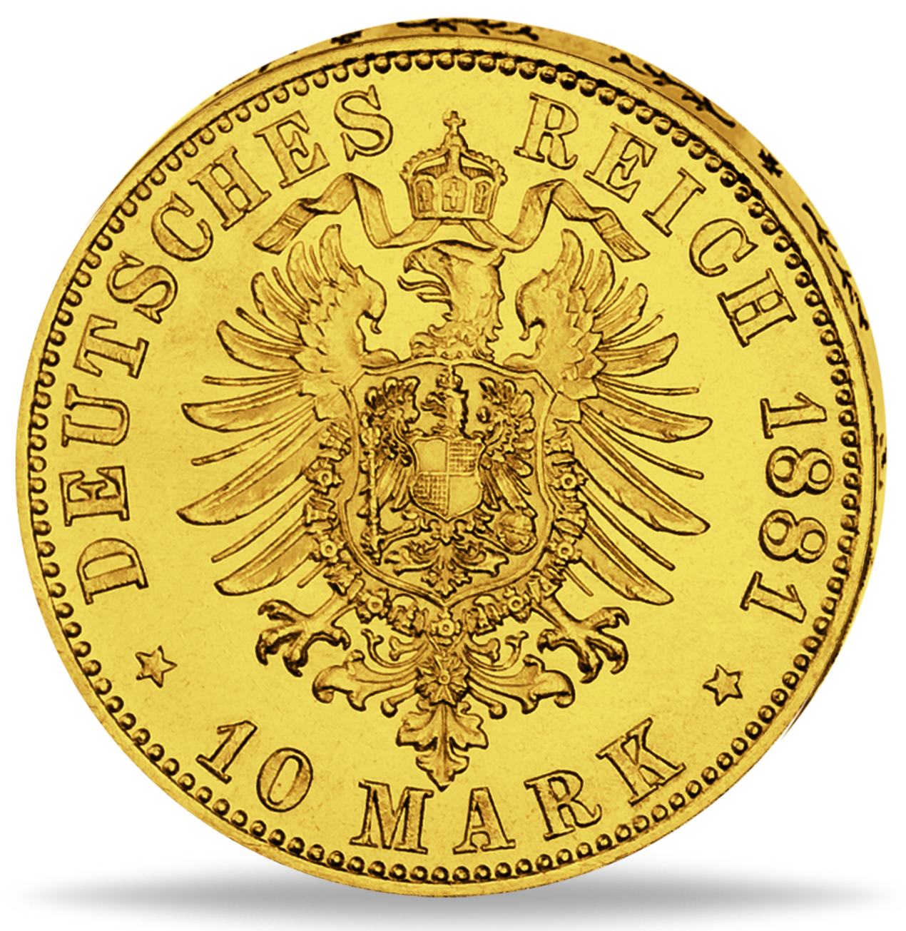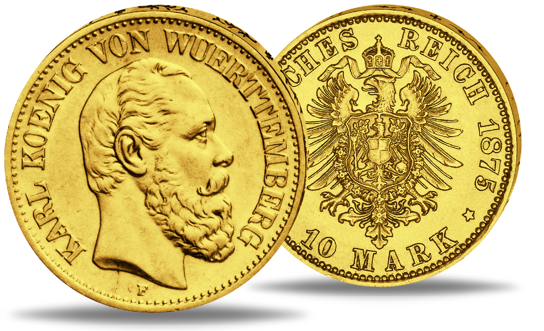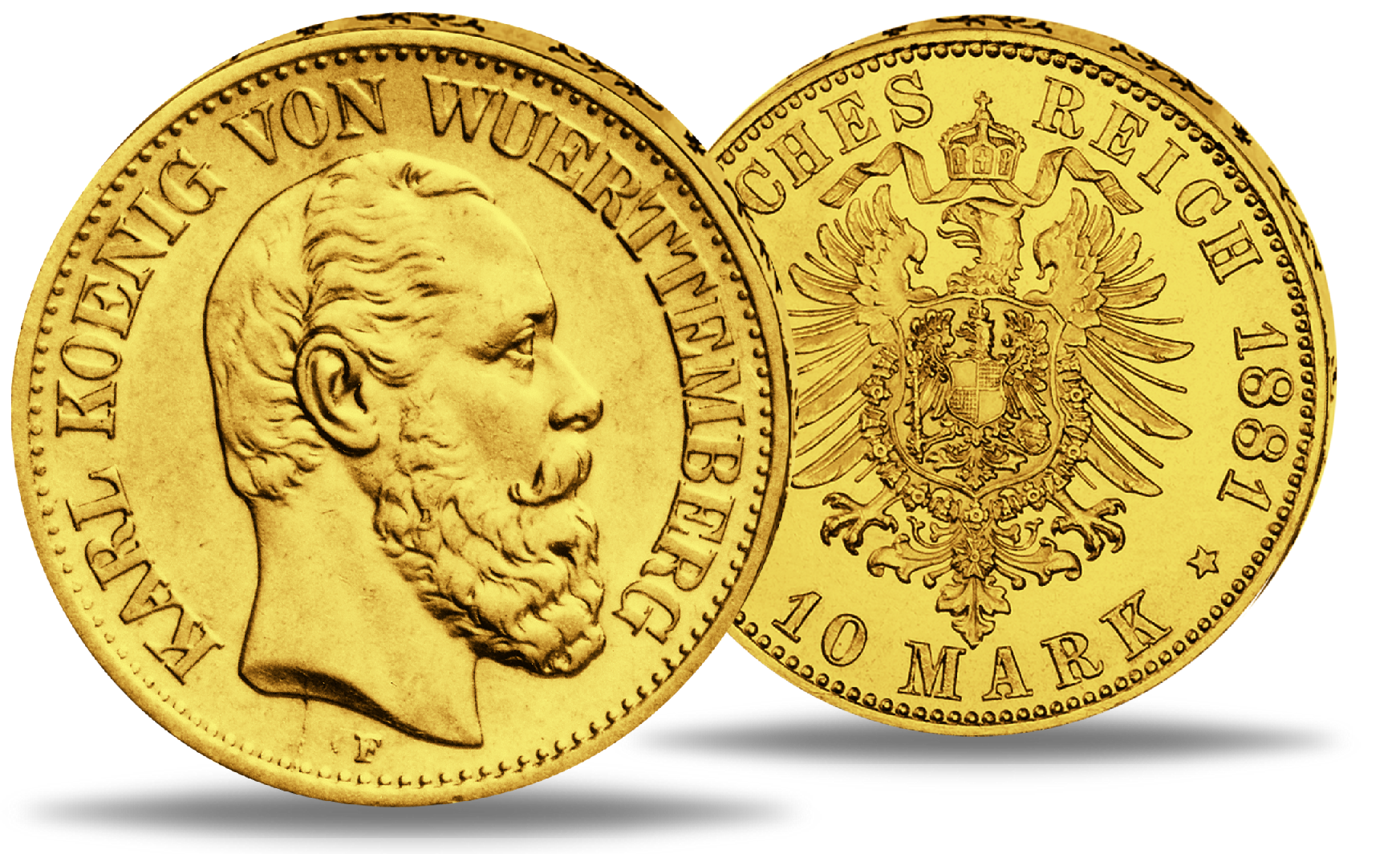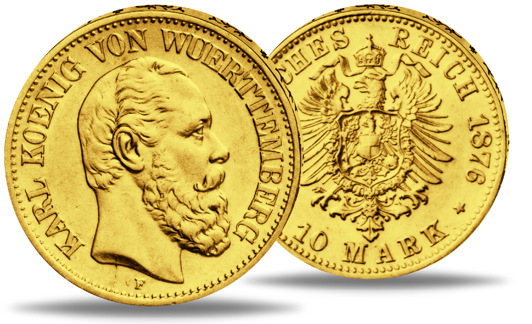 Komplett-Kollektion mit allen Jahrgängen der letzten 10-Mark-Goldmünze Württembergs mit kleinem Reichsadler !