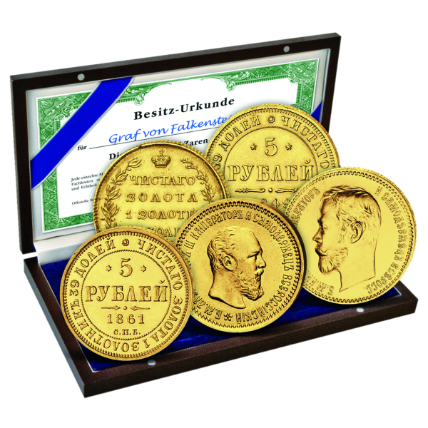 Die prächtigen 5 Rubel Goldmünzen dieser Zaren sind exklusiv bei uns in einen kompletten Satz vereint erhältlich. Aufgrund der geringen Auflage der einzelnen Münzen können wir Ihnen nur wenige Komplettsätze anbieten. Schnell sein lohnt sich!
